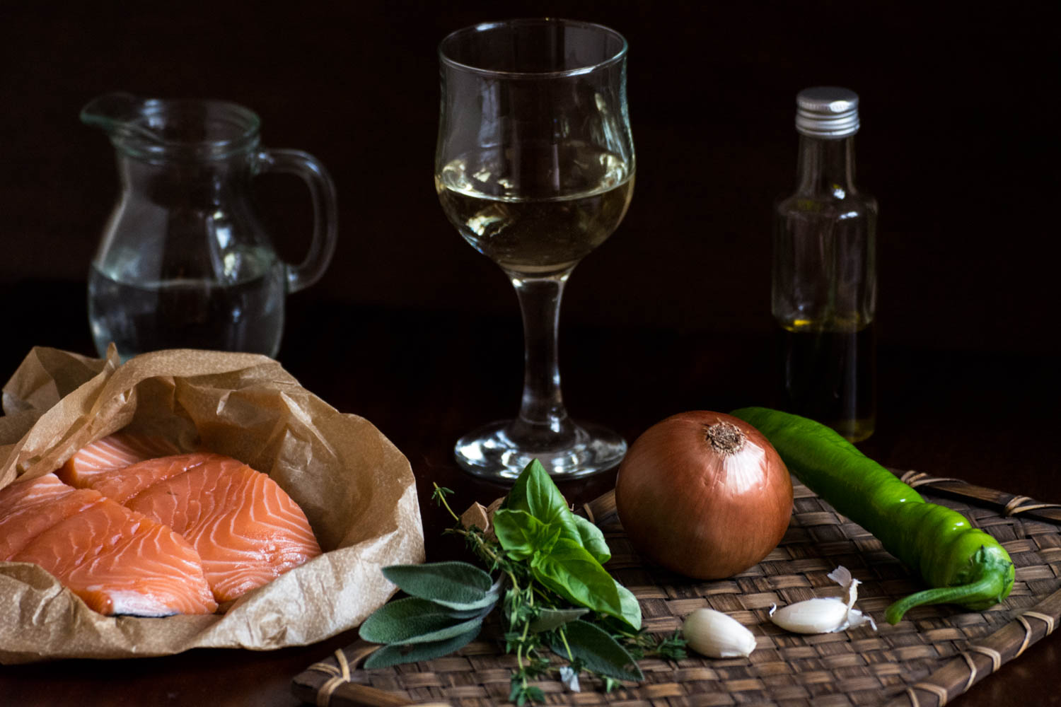 - Ceapa se taie solzi și se așează într-o tigaie (cu fund gros și cu capac). Se adaugă în tigaie ierburile aromatice, usturoiul decojit, apa și vinul. Amestecul se fierbe la foc mediu timp de 10 minute.