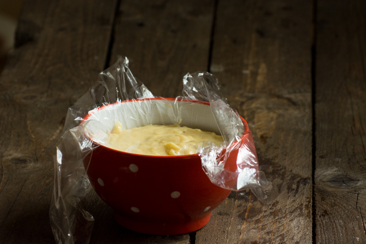 - Am turnat crema într-un vas tapetat cu folie de plastic și am acoperit-o cu o altă folie de plastic (pentru a evita formarea pojghiței), după care am lăsat crema la rece pentru 30 de minute.