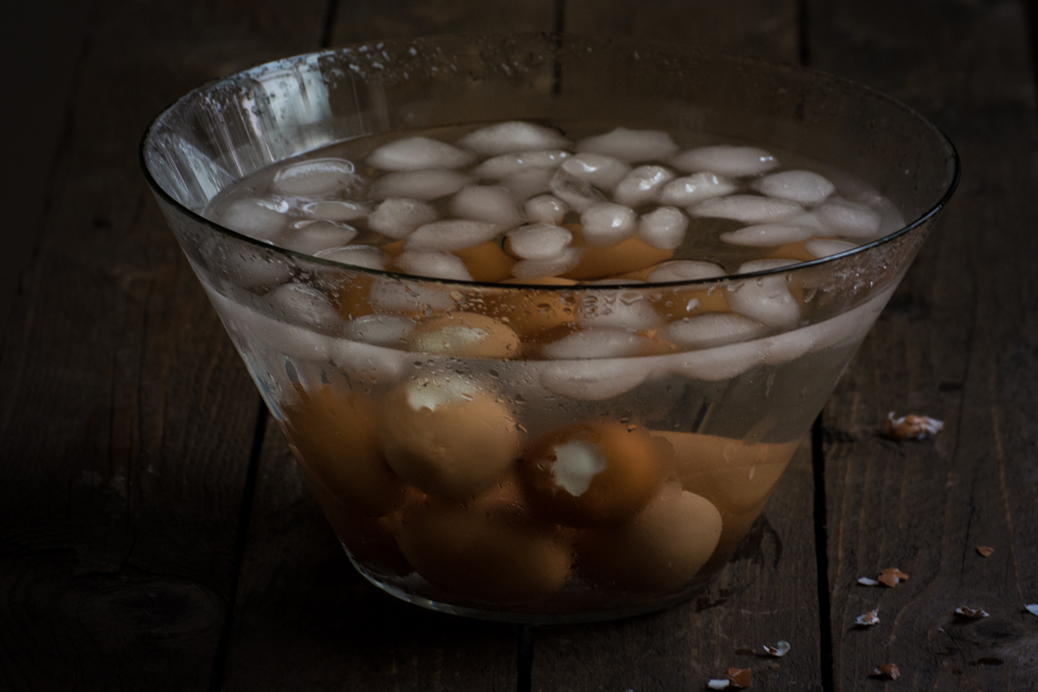 4. După cele 17 minute de preparare, am strecurat ouăle. Le-am decojit la bază (partea mai rotunjită a oului) și le-am pus în apă cu gheață pentru 10 minute (poză).