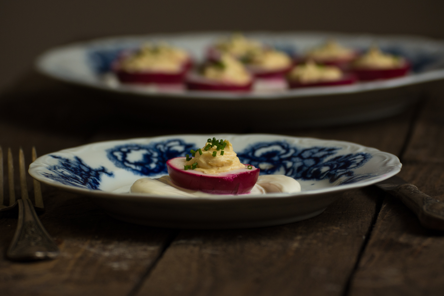 Plecând de la rețeta bunicii mele, am ajuns la o varianta vegetariană ceva mai sănătoasă. Ouăle fierte (și decojite) le-am colorat cu suc de sfeclă roșie, le-am umplut cu o cremă de brânză aromată și le-am servit alături de un sos remoulade ușor acid.
