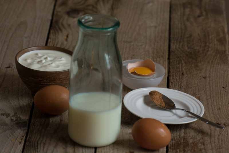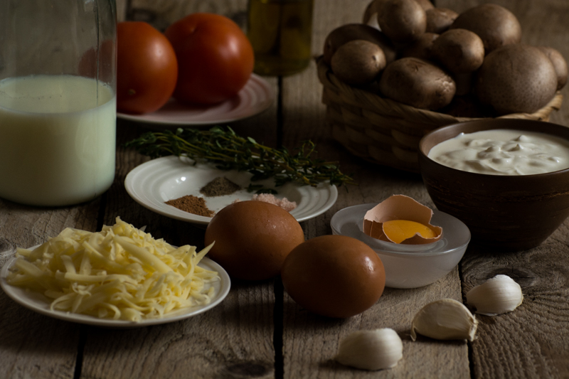 3. Se amestecă smântâna, laptele, ouăle, gălbenușurile, nucșoara, sarea și piperul și se adaugă peste ciuperci.