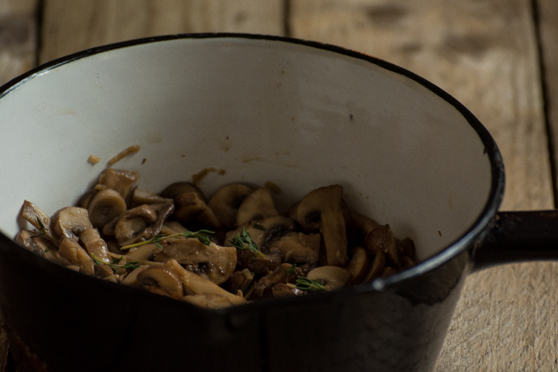 2. Într-o tigaie se pune uleiul și se încinge (la foc mediu). Ciupercile se călesc până când sucul lăsat de ele se evaporă (vreo 5 minute). Se adaugă usturoiul pisat, cimbrul tocat, sare și piper. Amestecul se mai ține pe foc vreo 2 minute, după care se așează în crusta coaptă în prealabil.