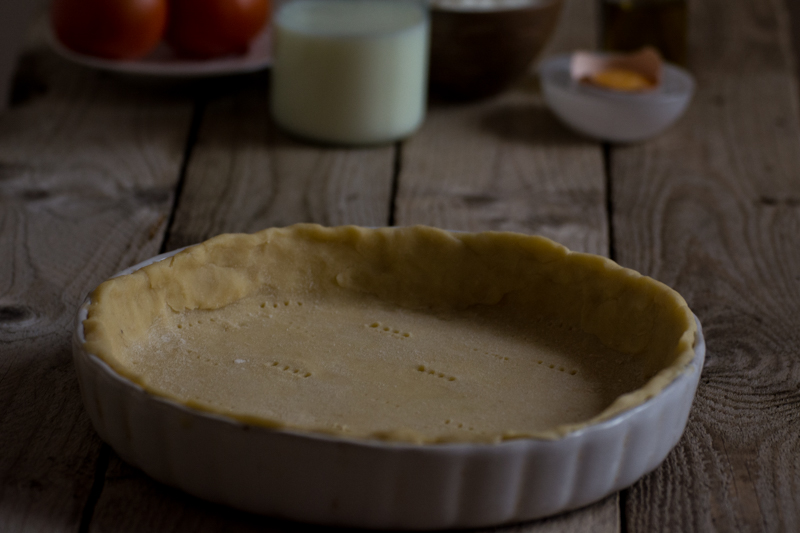 4. Discul de aluat format se așează într-o tavă rotundă (cu circumferința de 28 cm), se perforează cu o furculiță și se coace în cuptorul preîncălzit la 350°F/180°C (treapta 4) pentru 12-15 minute (trebuie să pară copt, dar nu rumen).