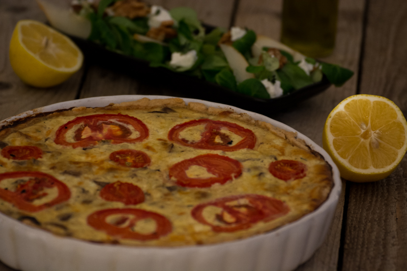 Quiche este o tartă sărată originară din Franța. Este o combinație perfectă de crustă crocantă și umplutură aromată. Aluatul de tartă (pâte brisée) este copt în prealabil și umplut cu legume sau derivate din carne, precum și cu un amestec cremos pe bază de smântână și ou. Eu am ales o variantă ovo-lacto-vegetariană, cu ciuperci și roșii, pe care am servit-o alături de o salată de valeriană.
