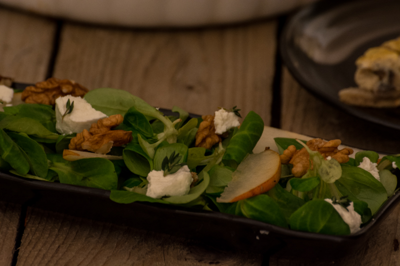 Quiche cu ciuperci și salată de valeriană, nuci și brânză de capră