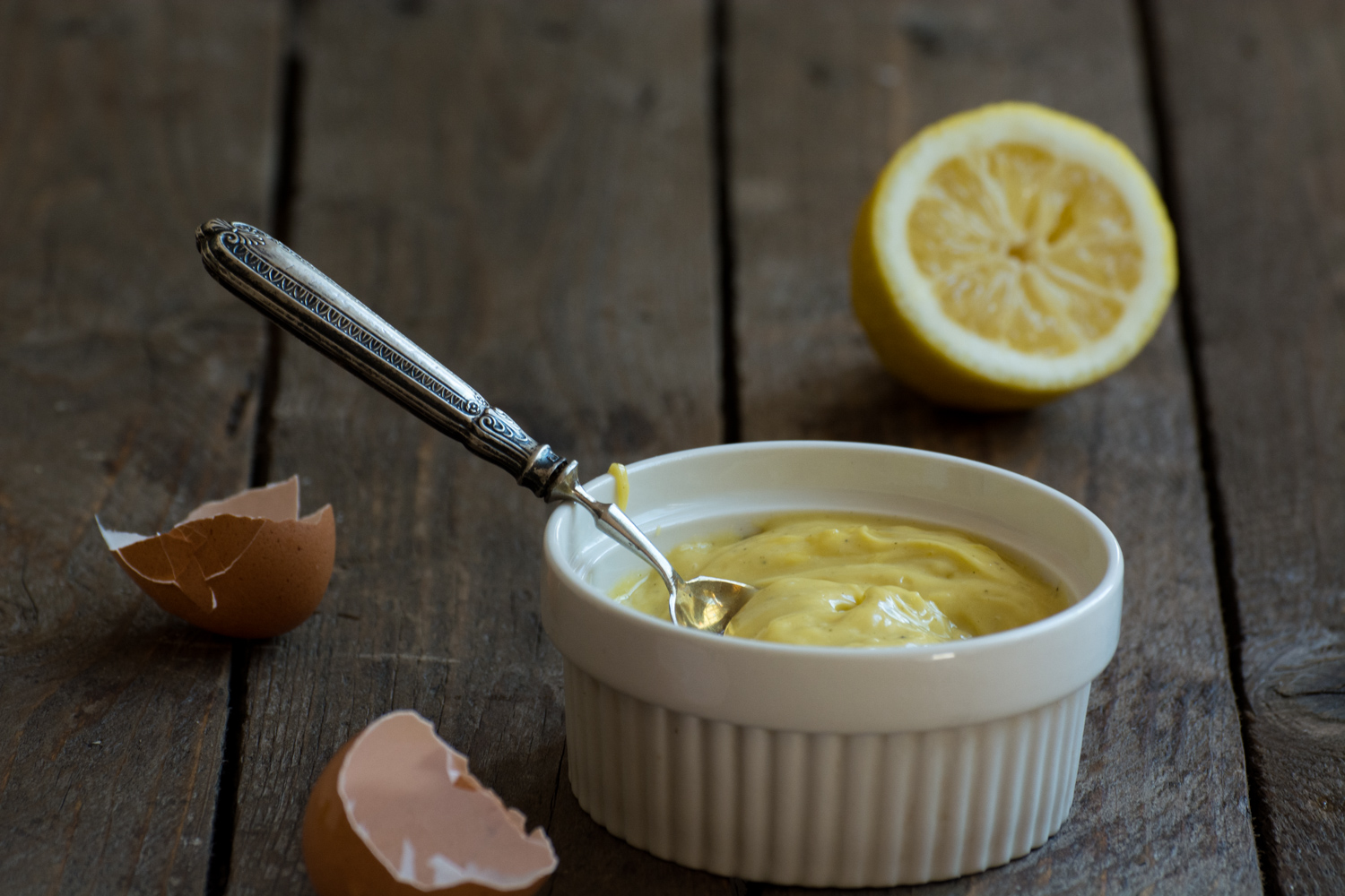- Într-un bol am amestecat gălbenușul cu muștarul, prin mișcări circulare și într-un singur sens, folosindu-mă de o lingură de lemn.