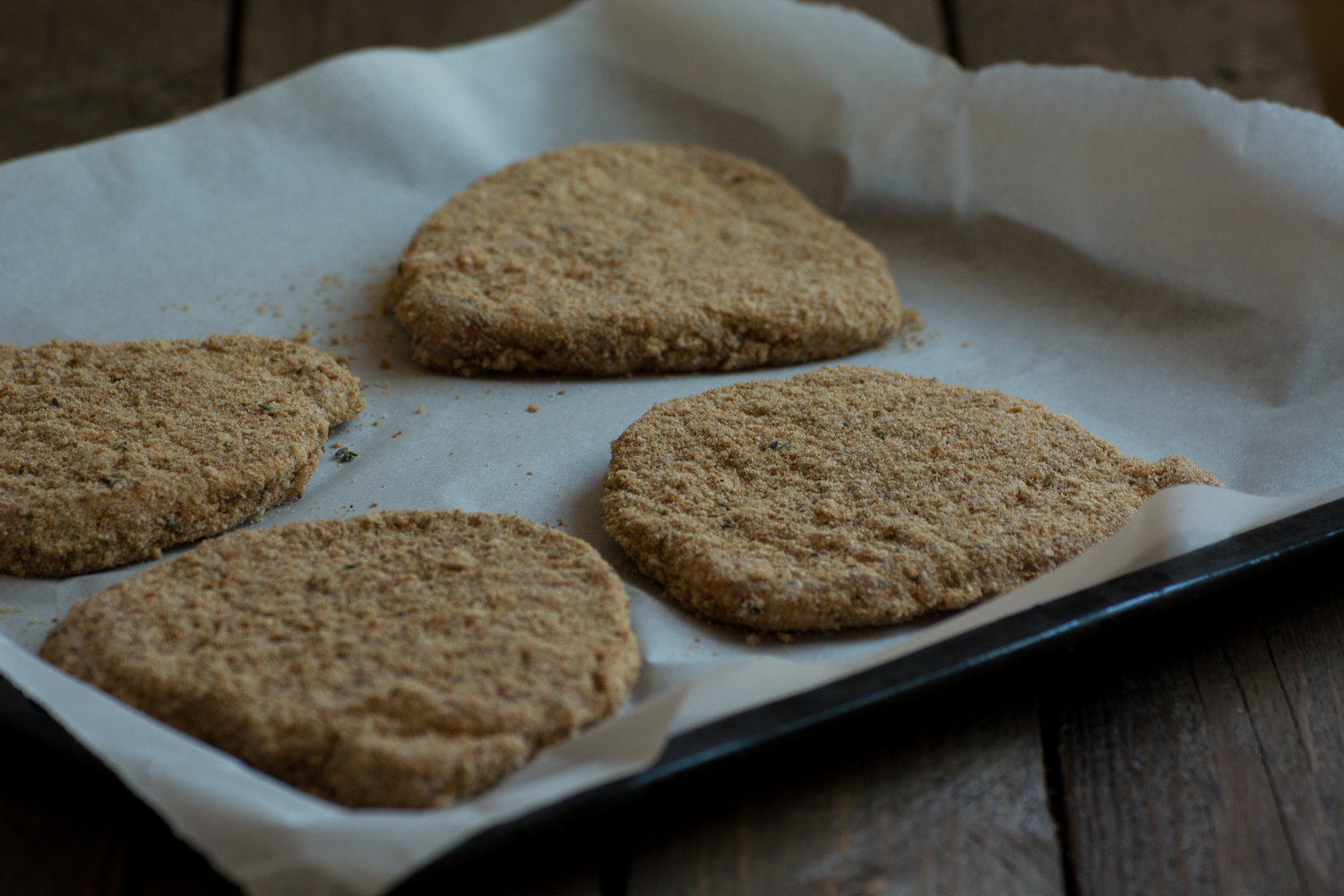 - Am trecut feliile de carne prin ou și apoi prin pesmet, având grijă să apăs pentru a se lipi crusta de carne. Am scuturat excesul de pesmet și am așezat cotletele pe o tavă tapetată cu hârtie de copt.