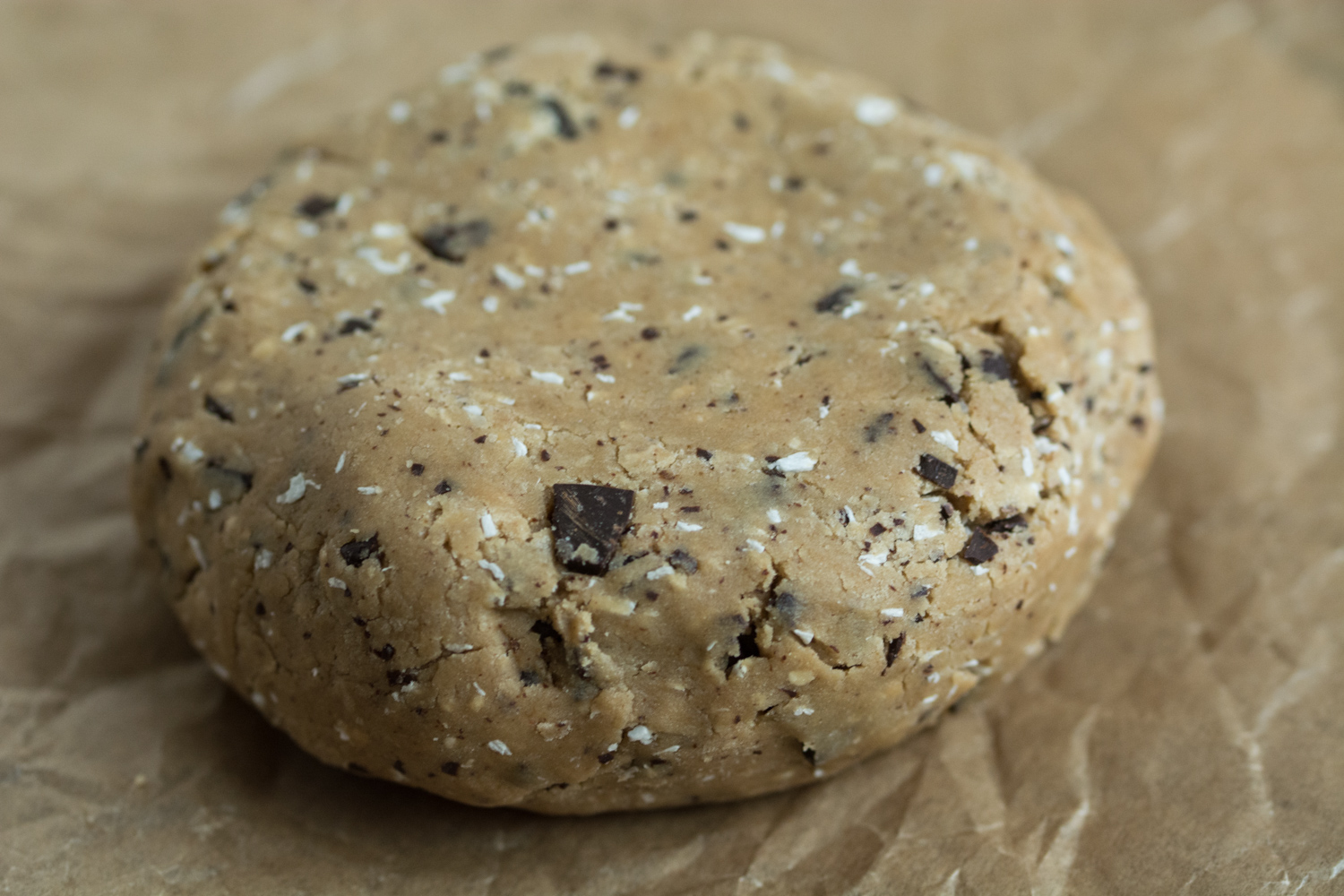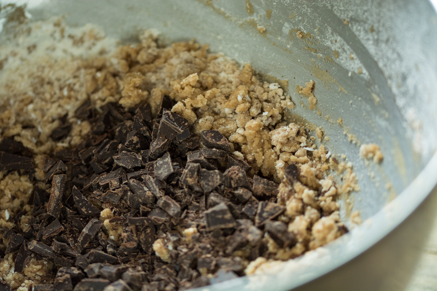3. Peste compoziția cremoasă de ulei, zahăr și lapte am adăugat ingredientele uscate și am amestecat cu mixerul încă vreo 10 secunde (în momentul acela compoziția părea reltiv uscată) – poză. Am adăugat fulgii de ciocolată și am format o minge de aluat cu mâinile.