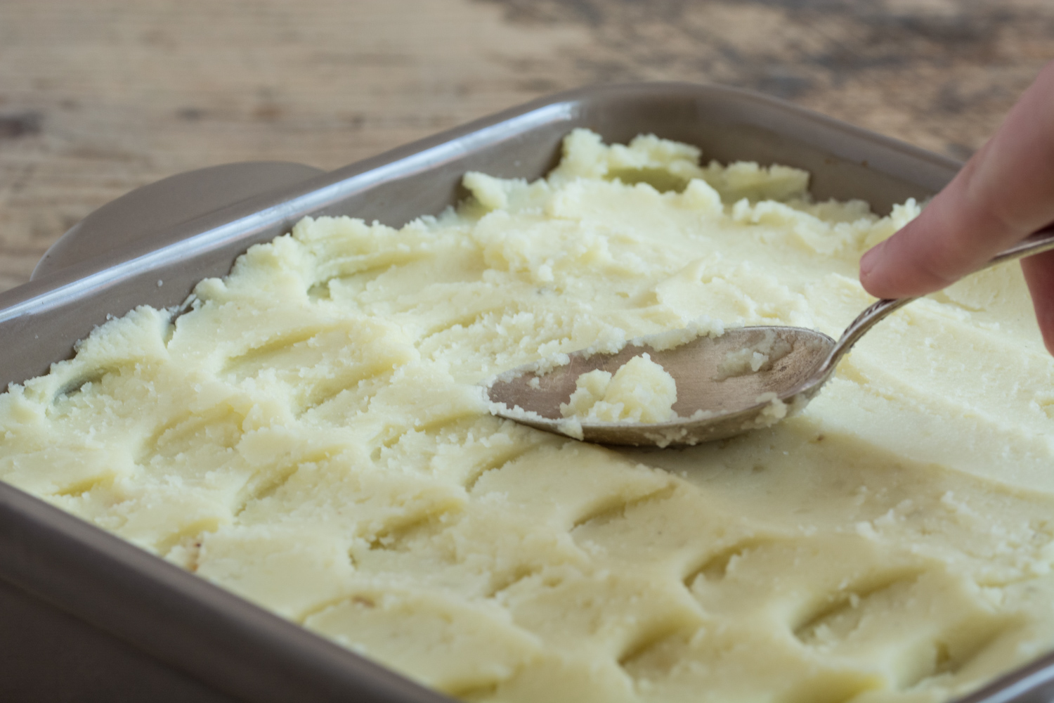 - Am turnat tocănița de ciuperci și tofu într-o tavă ceramică de 22x22cm și am acoperit-o cu piure.