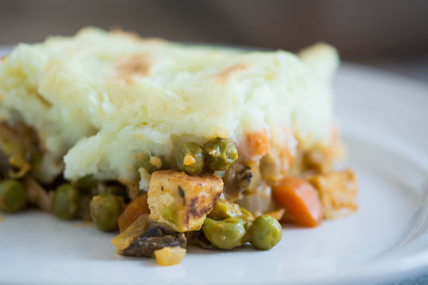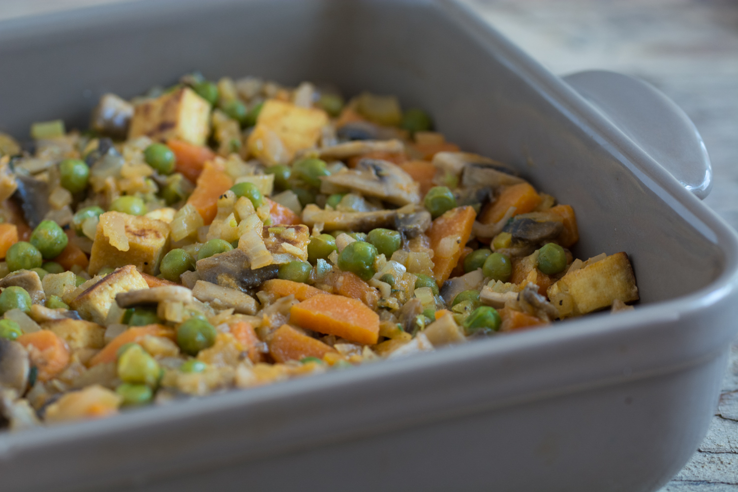 Eu am păstrat ideea de bază a rețetei și am transformat-o într-o plăcintă vegană, consistentă și hrănitoare, perfectă în perioada postului. Tocănița am preparat-o din ciuperci, mazăre și tofu și am acoperit-o cu un strat de piure de cartofi aromatizat cu cimbru si usturoi.