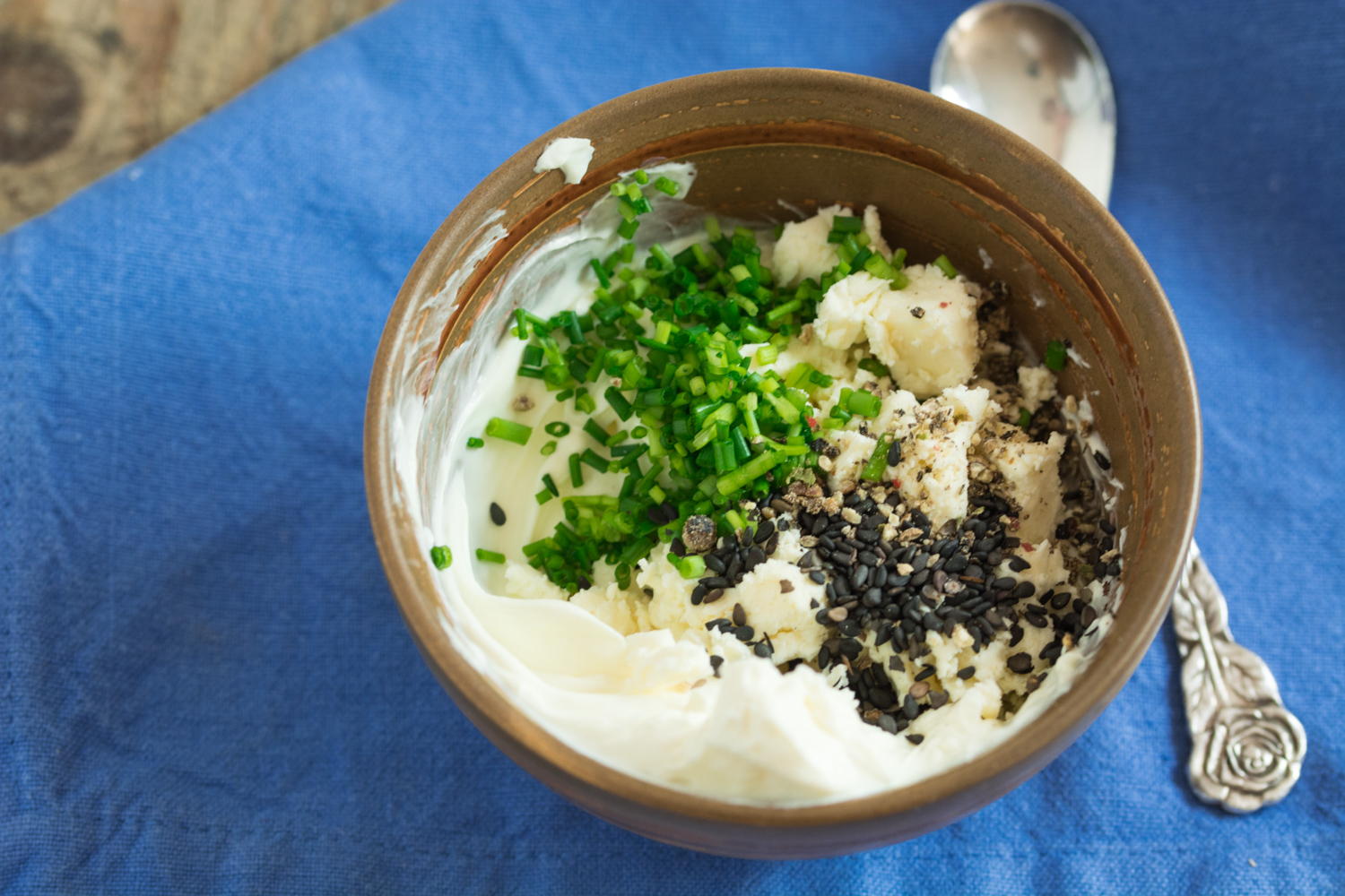 - Într-un bol am amestecat crema de brânză, telemeaua, chives, susanul, sarea, piperul și jumătate din gălbenusul de ou (pe cealaltă jumătate de gălbenuș am amestecat-o cu albușul).