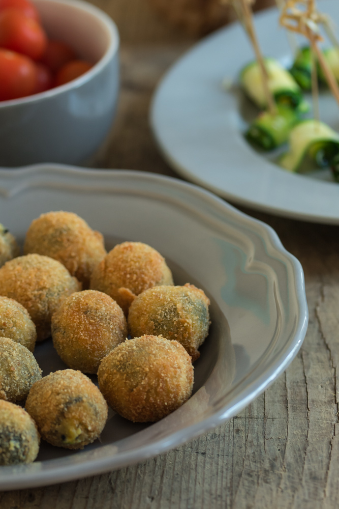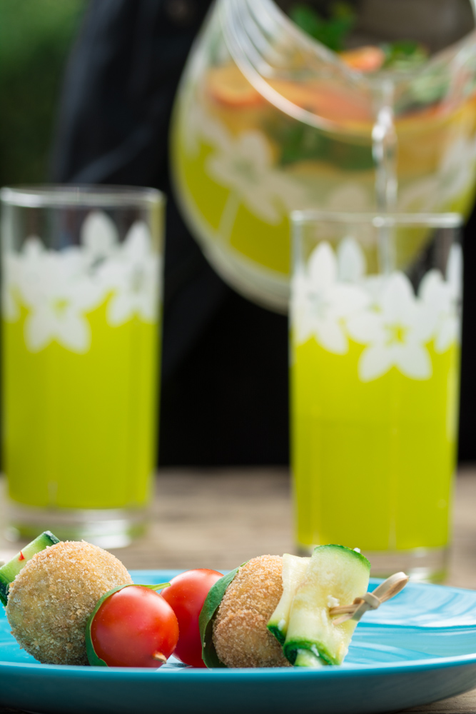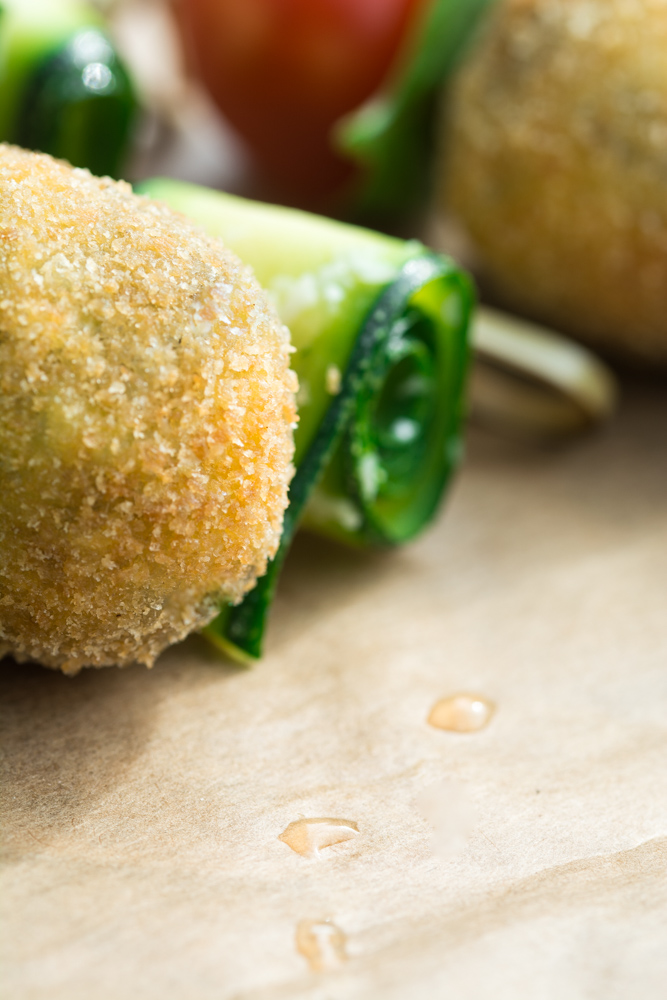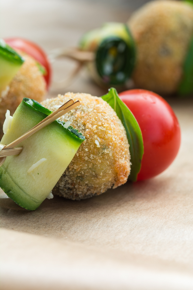 Frigărui din măsline crocante, roșii cherry și rulouri de zucchini