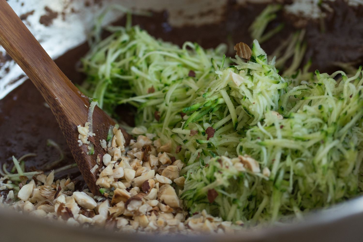 4. Am incorporat zucchini ras (pe care l-am stors în mâini) și alunele tocate și am turnat amestecul într-o tavă de cozonac tapetată cu hârtie de copt.