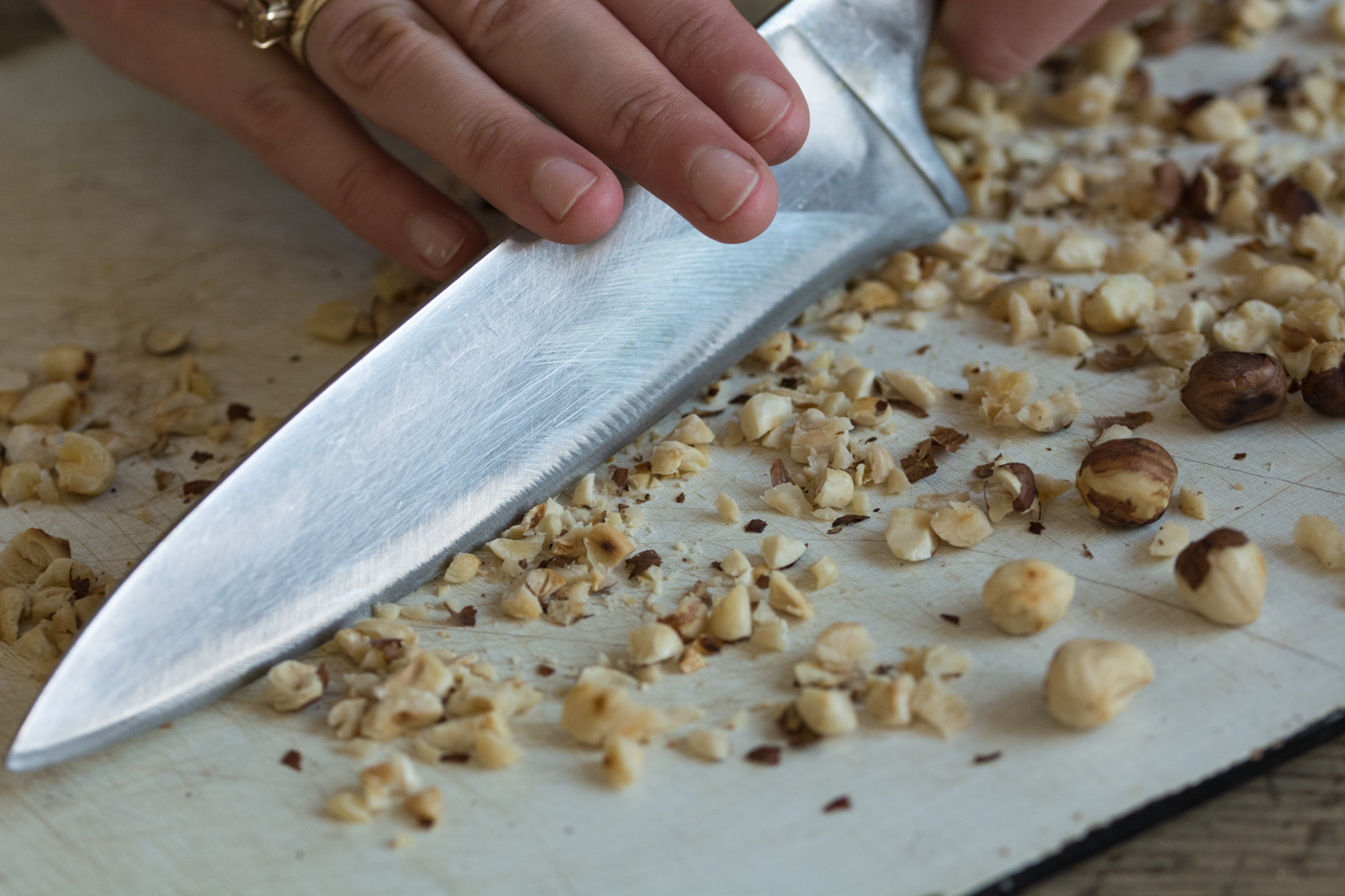 1. Într-o tigaie am rumenit alunele de pădure timp de vreo 5 minute, după care le-am lăsat să se răcoreacă. După ce s-au răcit le-am îndepărtat coaja și le-am tocat mărunt (poză).