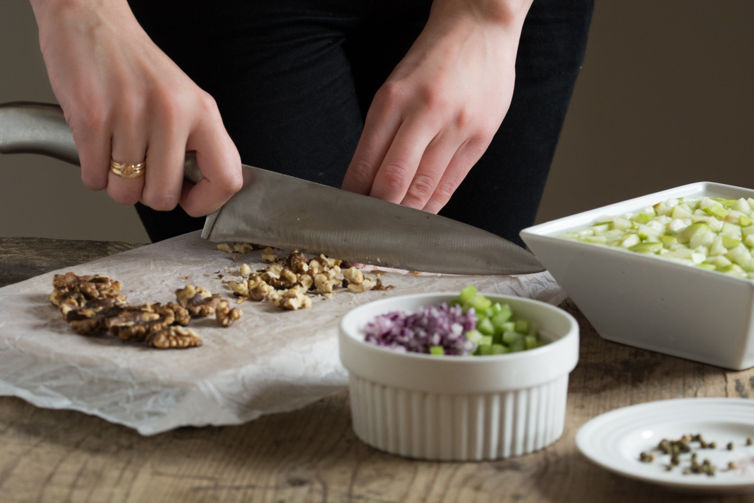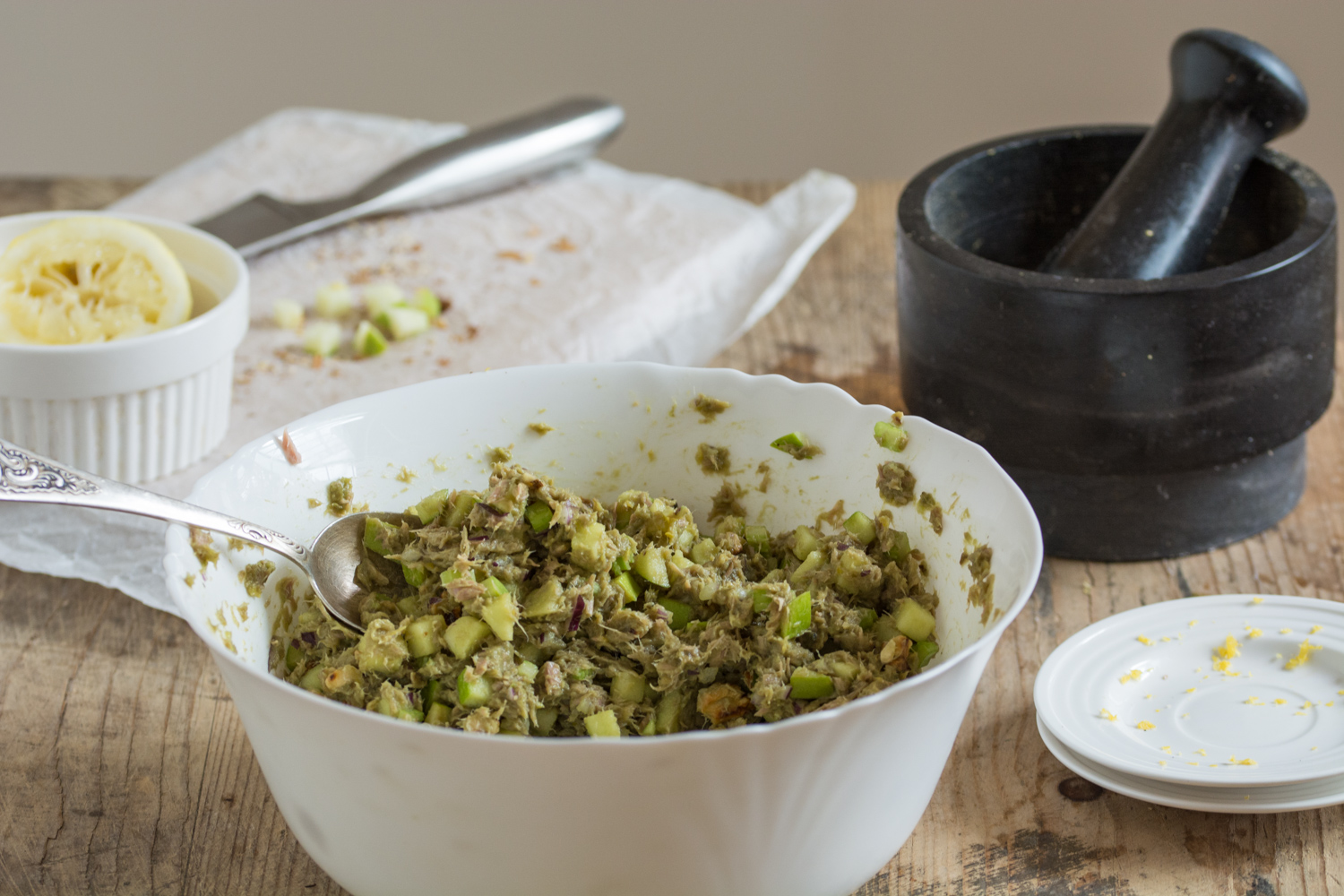 5. Am amestecat tonul cu celelalte ingrediente: nucile, ceapa, apio, avocado pasat, uleiul de măsline, cubulețele de măr (pe care le-am stors), coaja de lămâie și sucul celeilalte jumătăți de lămâie și am asezonat cu sare și piper.