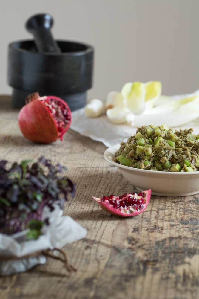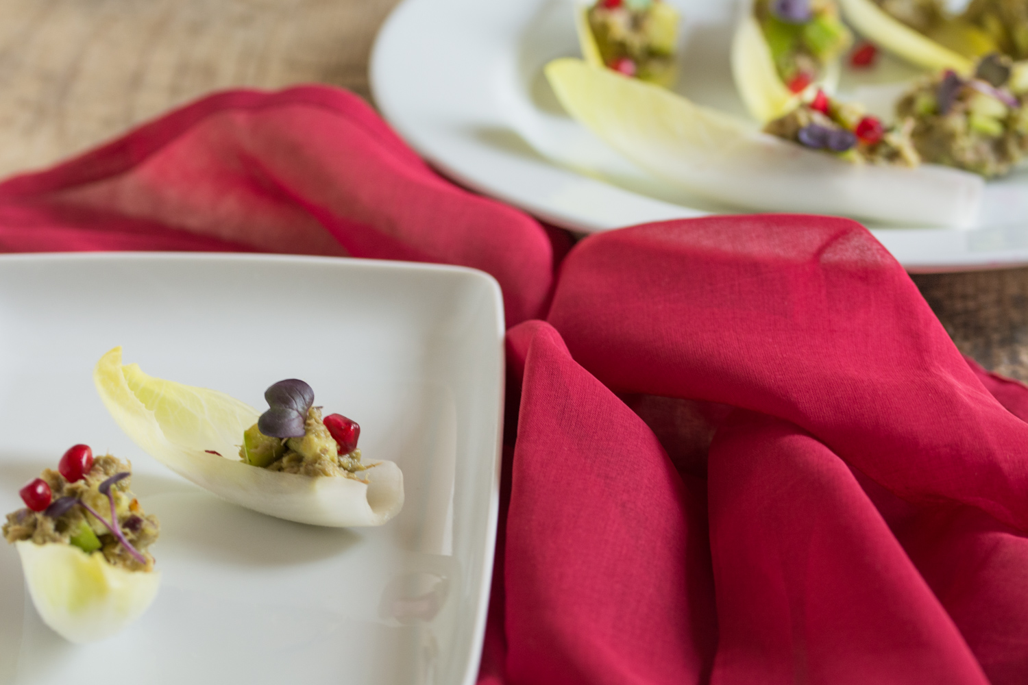 6. Am distribuit frunzele de andivă pe un platou și pe fiecare frunză am așezat câte 2 lingurițe de salată de ton. Am garnisit preparatul cu boabe de rodie și muguri de ridiche.