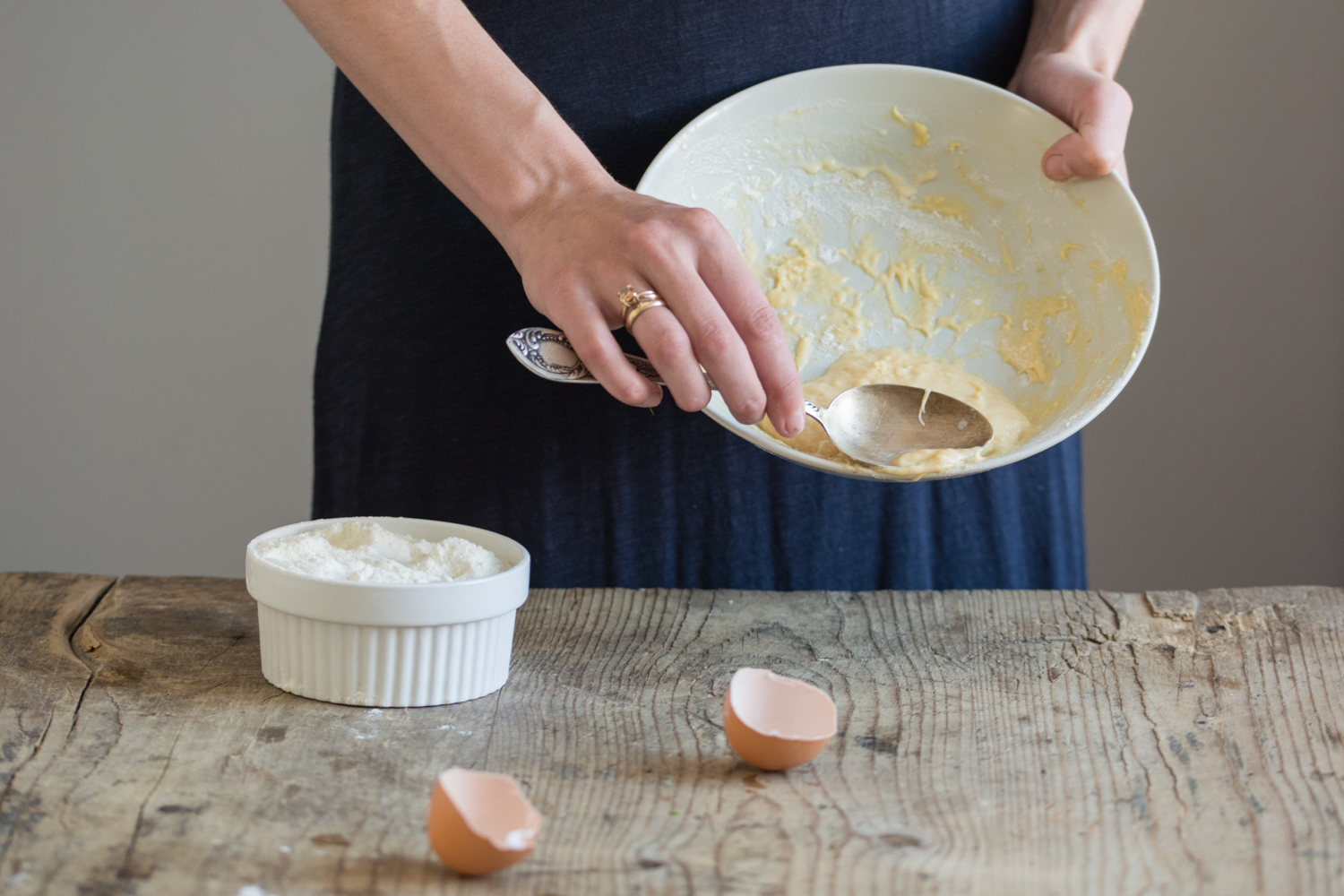 5. După cele 15 de minute am preparat găluștele. Am bătut ouăle împreună cu sarea și am adăugat treptat făina, amestecând încontinuu cu o lingură. Am lăsat amestecul de-o parte pentru vreo 5 minute, după care m-am apucat de modelarea găluștelor.