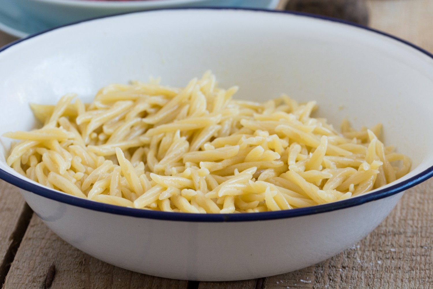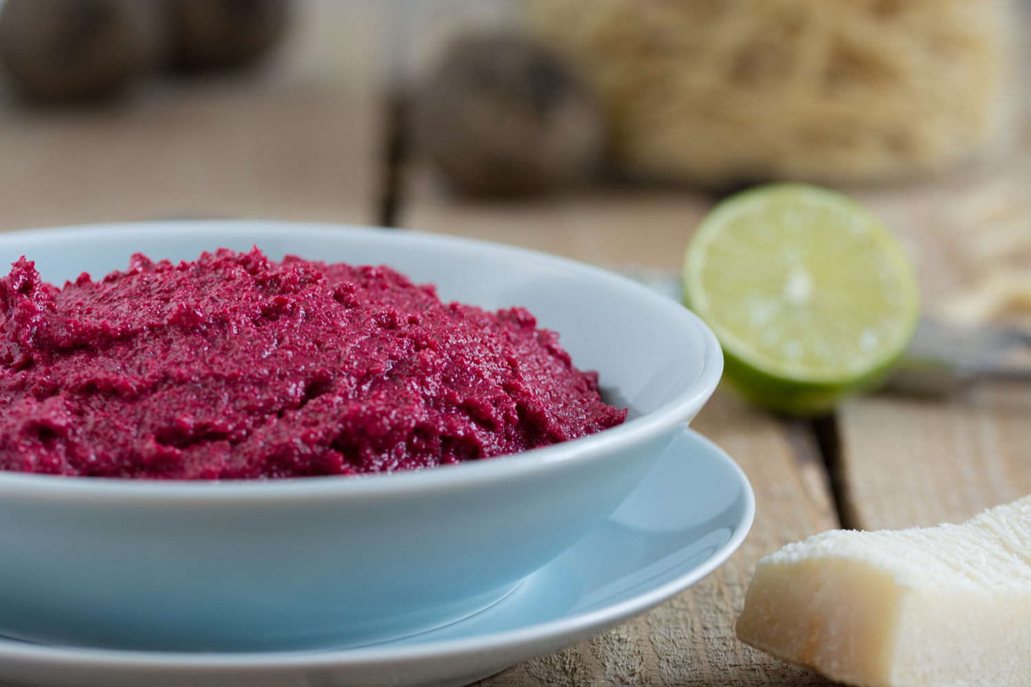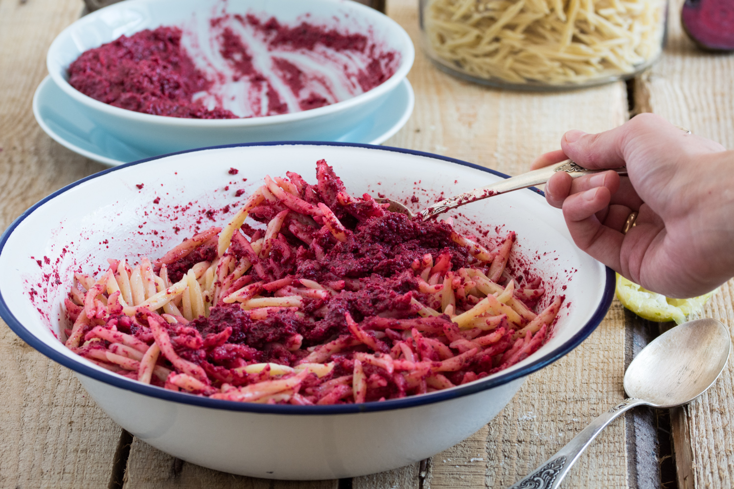Cum pesto alla genovese, varianta originală a celebrului sos, rezonează cu pastele trofie, eram tare curioasă să descopăr cum comunică pastele în discuție cu pesto-ul de sfeclă. Comunică extraordinar, își șoptesc povești de dragoste!