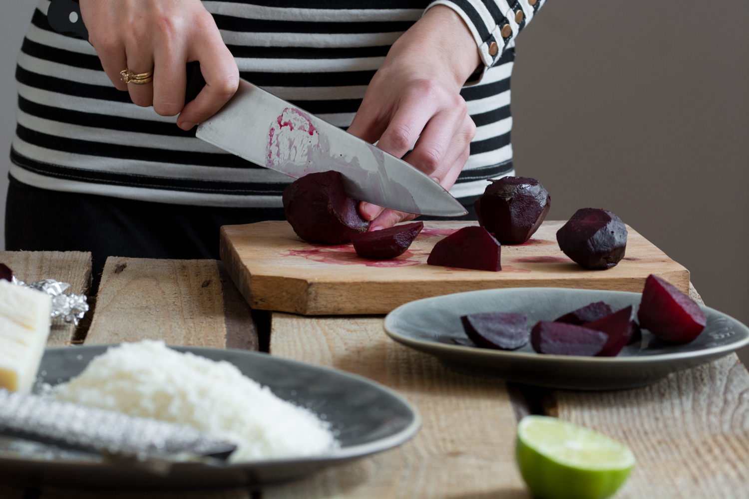 - Decojirea sfeclei. După 40 de minute am verificat dacă sunt fragede, înțepându-le cu un cuțit. Le-am lăsat deoparte pentru 5 minute să se răcească în folia de aluminiu în care s-au copt. După 5 minute le-am decojit și le-am tăiat în sferturi (eu nu am folosit mănuși și m-am pătat pe degete, așa că recomand folosirea lor). Aveam 200g de bucăți de sfeclă.