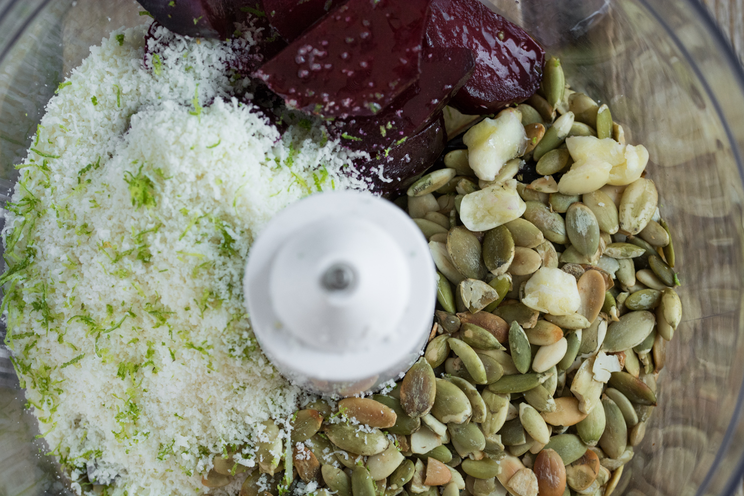 - Prepararea sosului. Am așezat semințele de dovleac în vasul unui robot de bucătărie și le-am măcinat. Am adăugat sferturile de sfeclă, brânza rasă, usturoiul decojit, coaja și sucul de lime. În timp ce robotul era pornit, am adăugat uleiul de măsline în fir subțire, până am ajuns la consistența unui sos omogen.