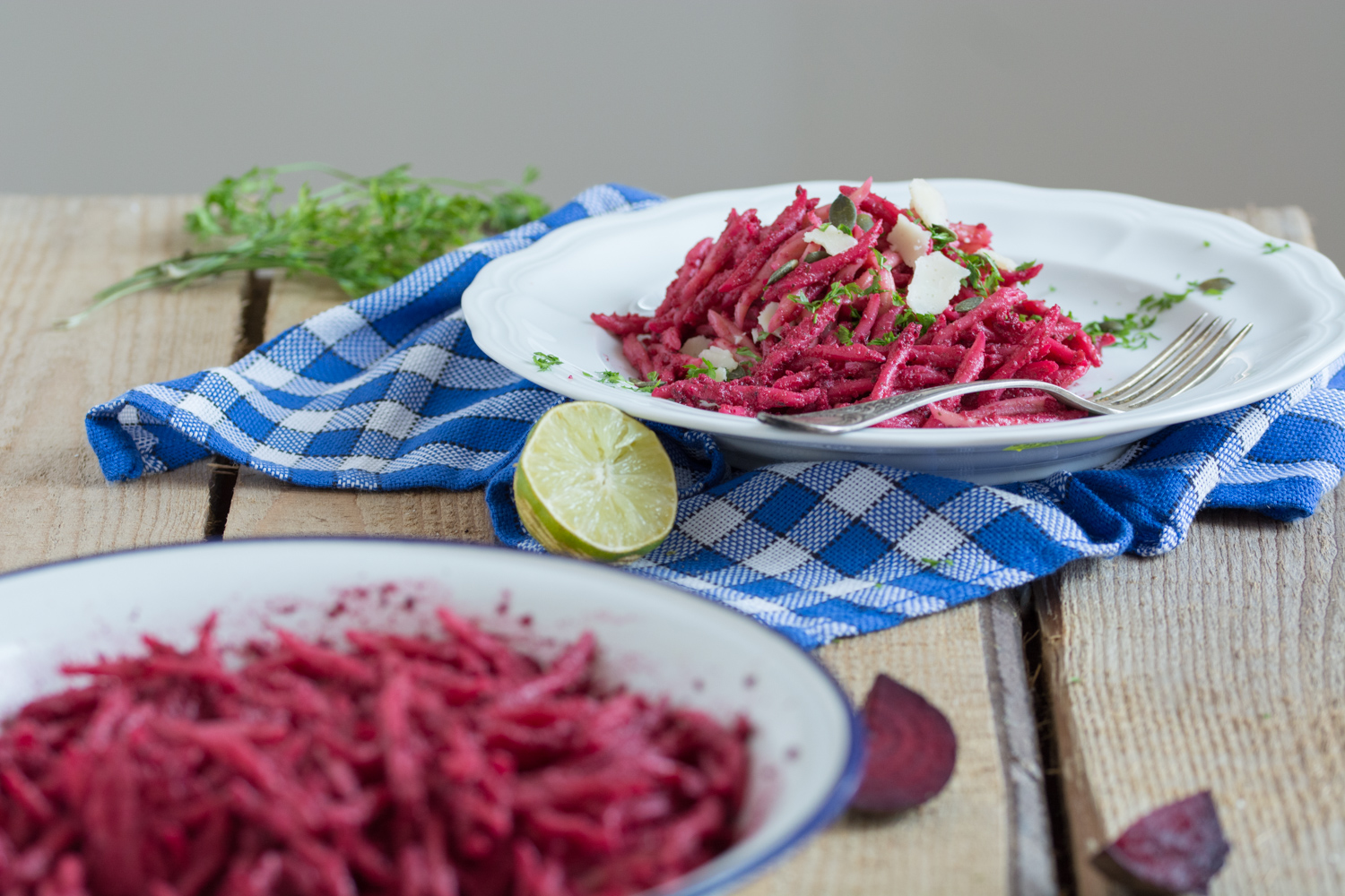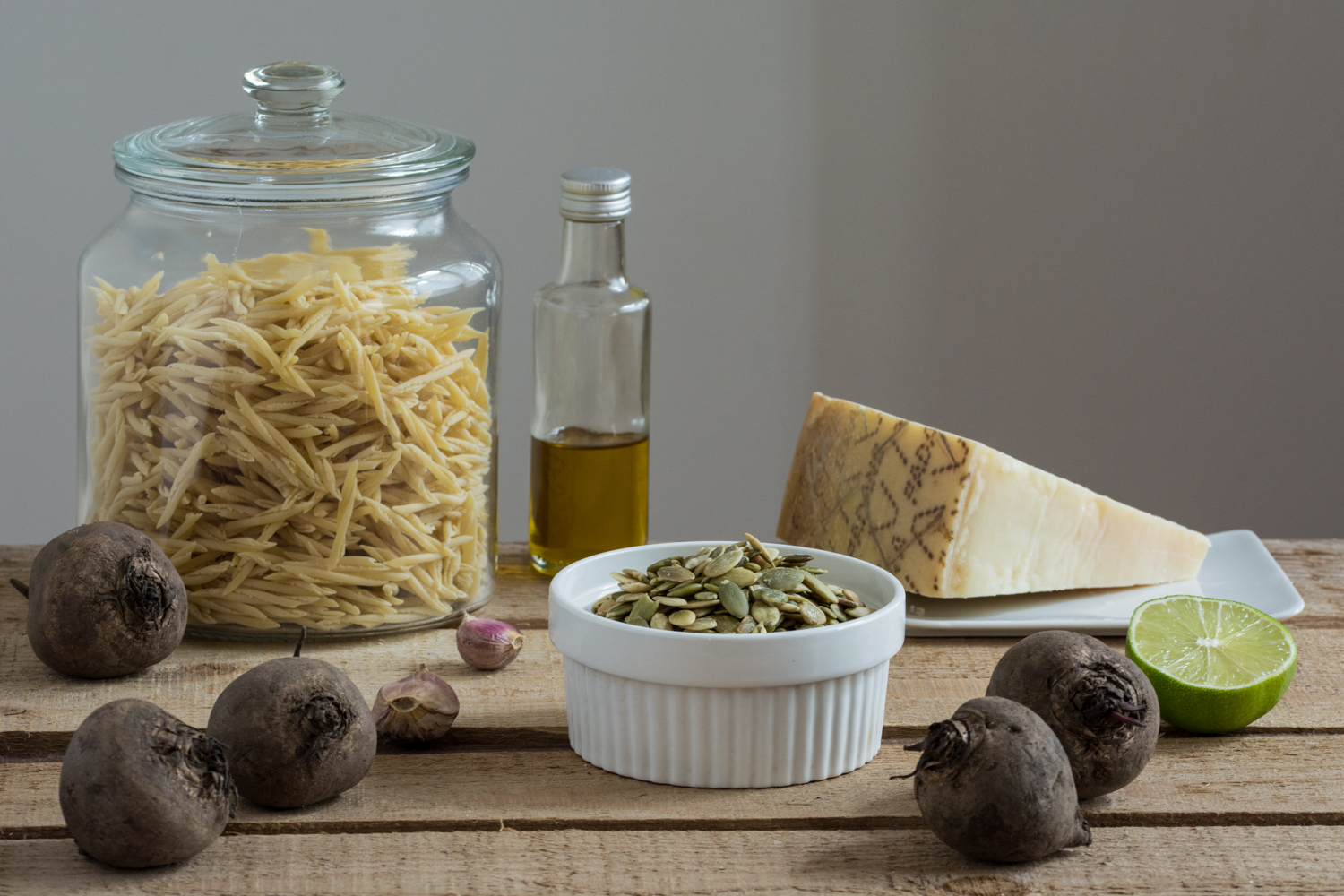 Dacă tot a venit toamna și dârdâi de frig de câteva zile bune, am început să incorporez în rutina culinară și rețete cu caracter autumnal. Și ce-ar fi toamna fără legume? Iubesc din tot sufletul toamna și legumele ei minunate, consistente și pline de aromă. Azi am avut la îndemână câteva sfecle roșii mici și foarte parfumate și m-am gândit să le împrietenesc cu semințe de dovleac (că tot e și sezonul dumnealui) și cu niște Grana Padano rasă și să le transform într-un pesto tomnatic. Zis și făcut! În timp ce sfeclele se coceau cumințele în cuptor, am fiert al dente niște paste. De regulă prefer să le prepar eu, dar acum am apelat la cutia ce stătea de câteva săptămâni, stingheră, pe un raft din cămară. A rezultat un preparat consistent, cu o culoare aproape ireală și un gust diferit, extrem de interesant, bogat, astringent, ușor citric, un gust de octombrie.