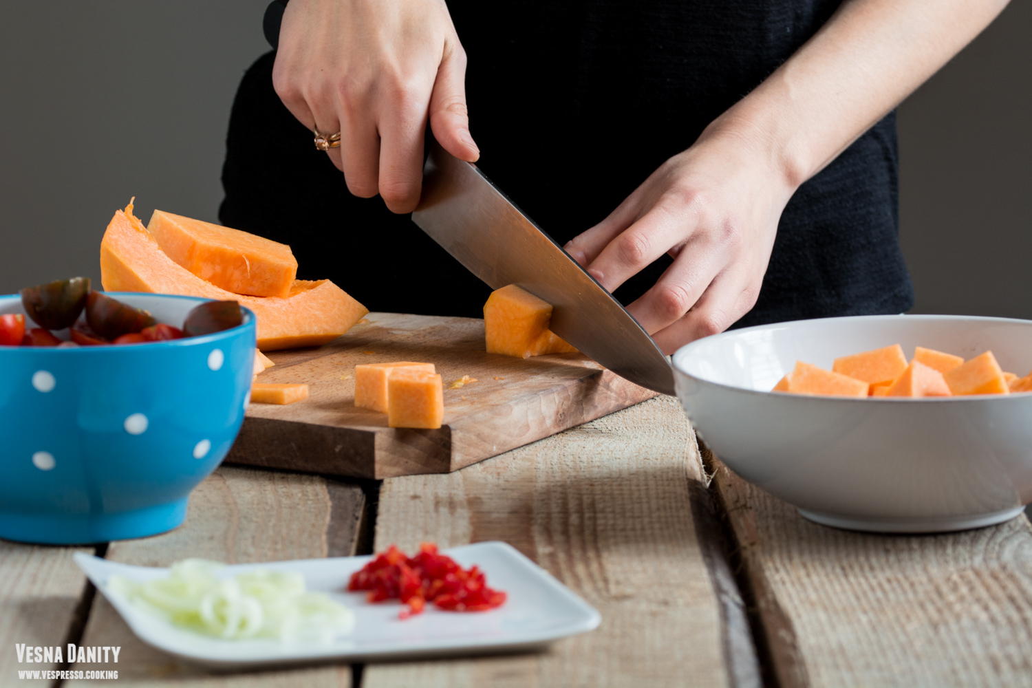 - Cu un cuțit ascuțit am decojit dovleacul, apoi l-am tăiat în cubulețe (am avut 500g de cubulețe). Ideal ar fi ca bucățelele să fie cam de aceeași dimensiune pentru a se coace concomitent. Resturile de dovleac care rămân în urma decupării le folosesc la supe-creme.