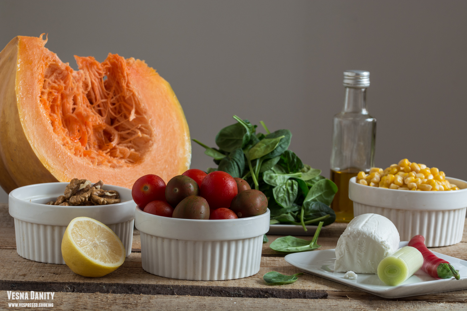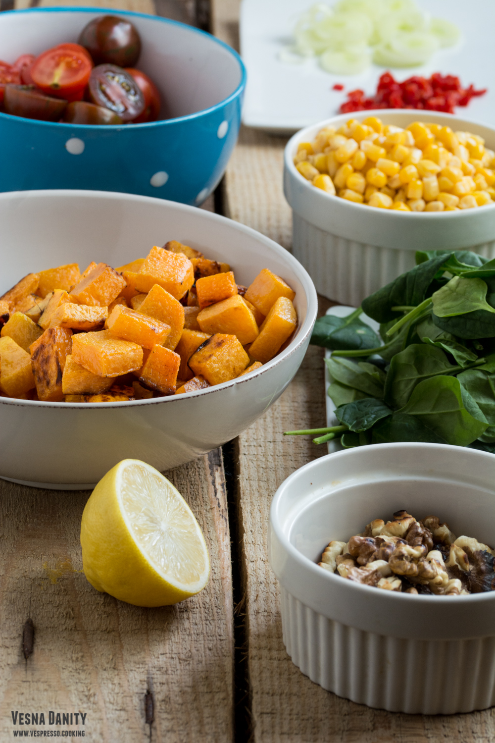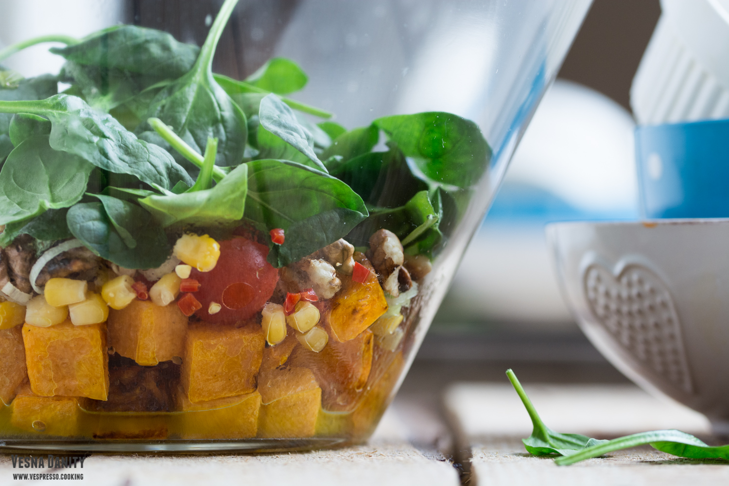 - Am adăugat cubulețele de dovleac copt, porumbul, roșiile cherry, nucile, rondelele de praz, ardeiul iute și spanacul și am amestecat cu ajutorul a două linguri.