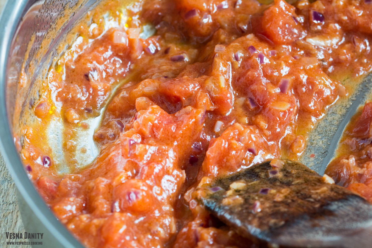 5. Am luat o tigaie încăpătoare și am topit untul la foc mic-mediu. Am adăugat usturoiul și ghimbirul ras și am amestecat timp de 1 minut. Am adăugat ceapa și am sotat-o până când s-a înmuiat. Am adăugat roșiile si am lăsat amestecul să fiarbă la foc mic pentru 5 minute.