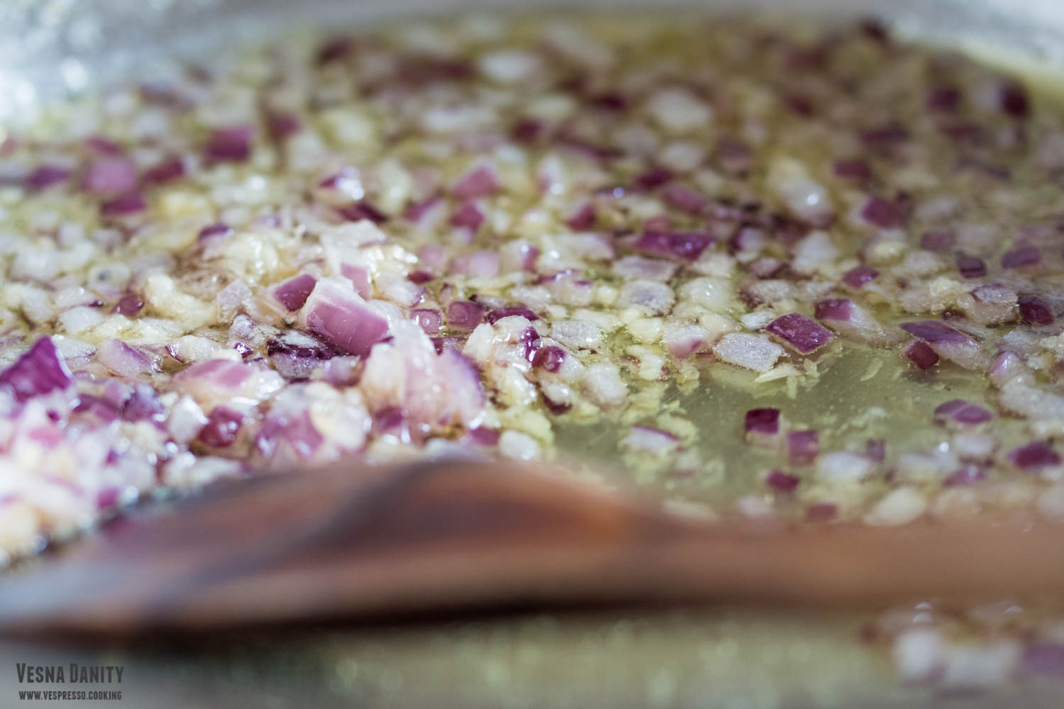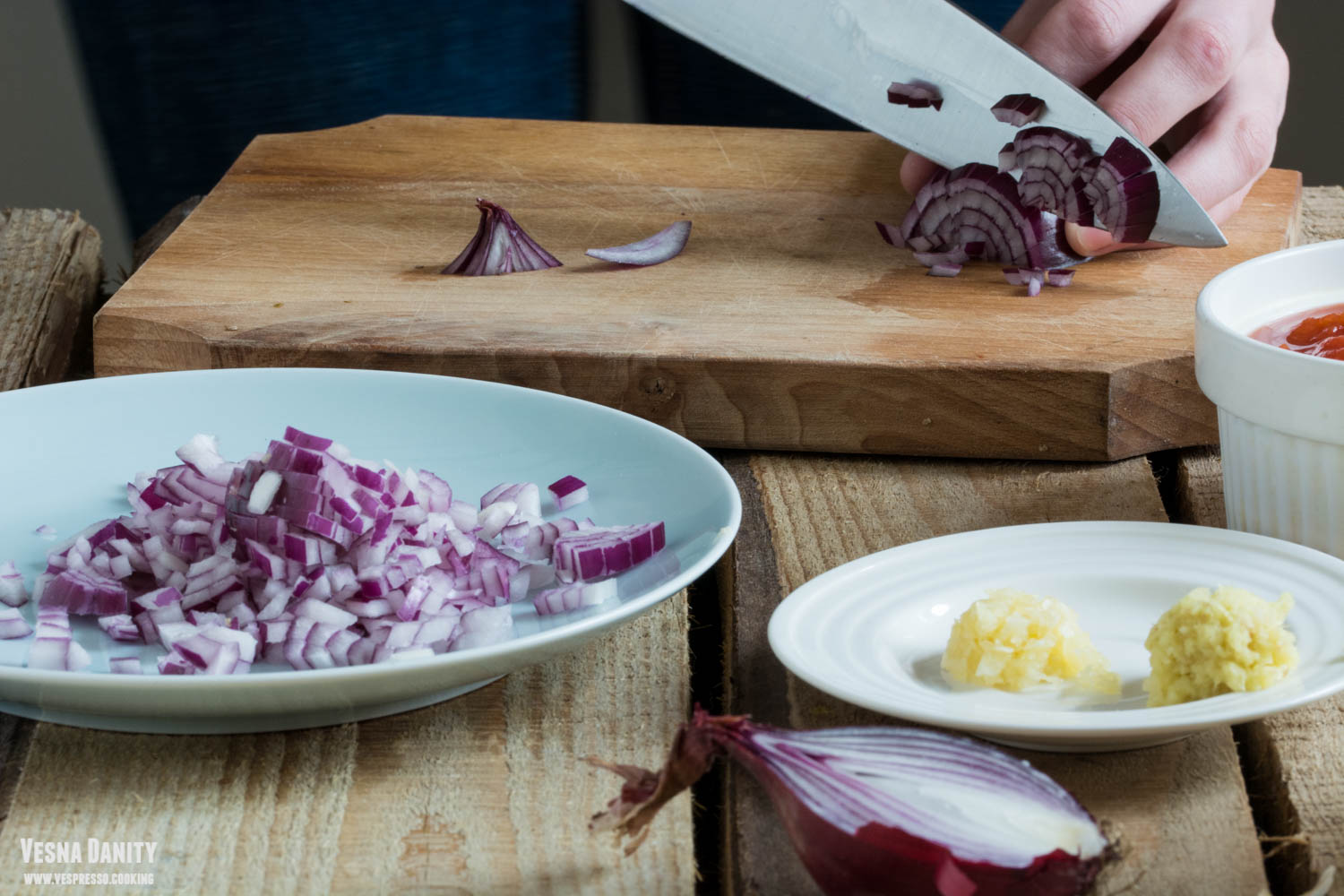 4. Până când s-a copt sfecla, m-am ocupat de legume. Am curățat ceapa și am tocat-o fin. Am decojit cățeii de usturoi, le-am eliminat inimile (porțiunea din mijloc) și i-am tocat fin. Am decojit ghimbirul, după care l-am ras.