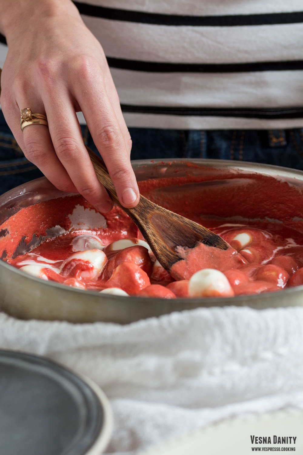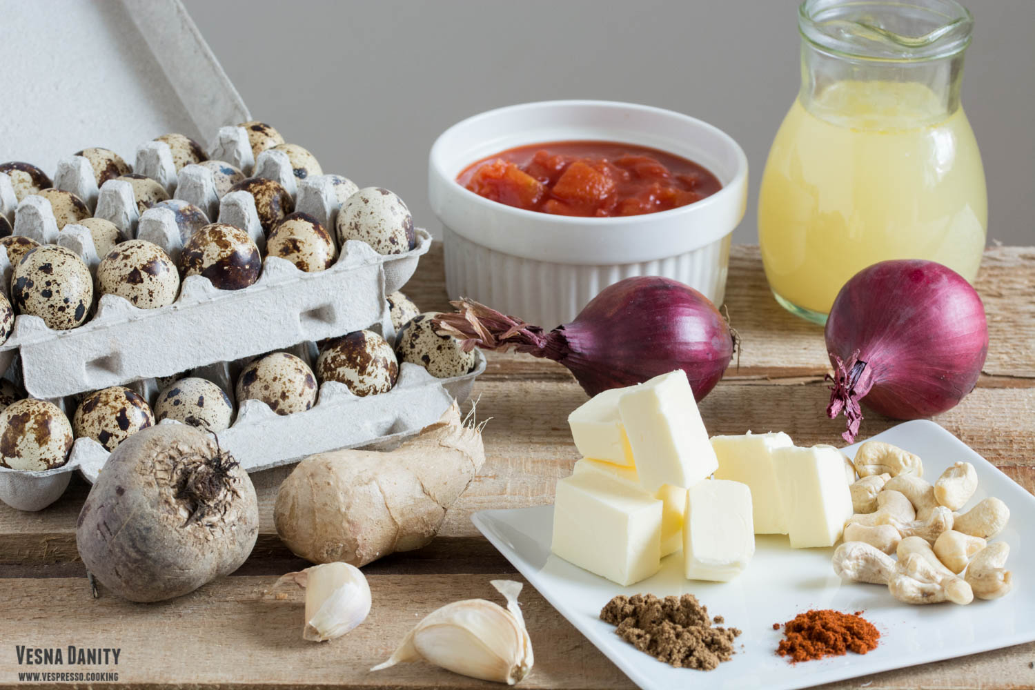 Ouă de prepeliță servite într-un sos de unt, sfeclă și roșii, catifelat și parfumat cu Garam Masala, celebrul amestec de condimente. Nu știu dacă sună bine sau nu, dar e divin. Rar mă dă pe spate câte o combinație de arome, nu că aș fi eu greu impresionabilă, dar încerc să-mi mențin calmul culinar. Însă combinația aceasta de arome mă fascinează, mă răvășește și mă duce chiar și în punctul de a o găti la 12 noaptea, în pijamale, dacă mi se face dor.