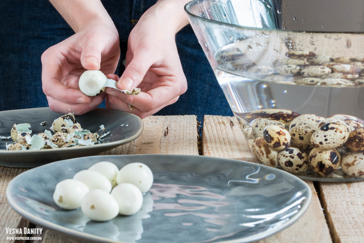 3. Am spălat ouăle de prepeliță, le-am așezat într-o oală și le-am acoperit cu apă rece. Am pus oala pe aragaz la foc mediu-mare și am așteptat să dea în clocot. Când a început să fiarbă, am redus focul la minimum și am fiert ouăle timp de 3 minute. Le-am scos într-un bol cu apă rece și le-am decojit.