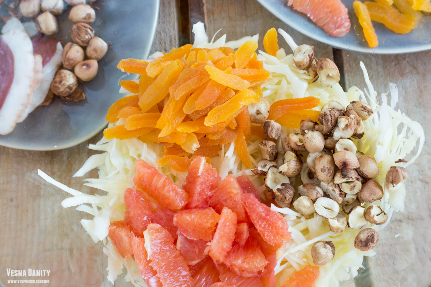 Salata de varză cu piept de rață e o salată cel puțin interesantă, dacă nu nemaipomenită. E interesantă din punct de vedere cromatic, vizual, olfactiv, auditiv, și nu în ultimul rând, gustativ. Îți încântă simțurile prin texturi contrastante, arome previzibil de imprevizibile și culori calde. Panglici crocante de varză îmbrăcate în ulei de măsline și oțet de mere, alune de pădure coapte, felii suculente de portocale roșii, fâșii parfumate de caise și felii sărate de pastramă de rață. Cam asta-i povestea salatei.