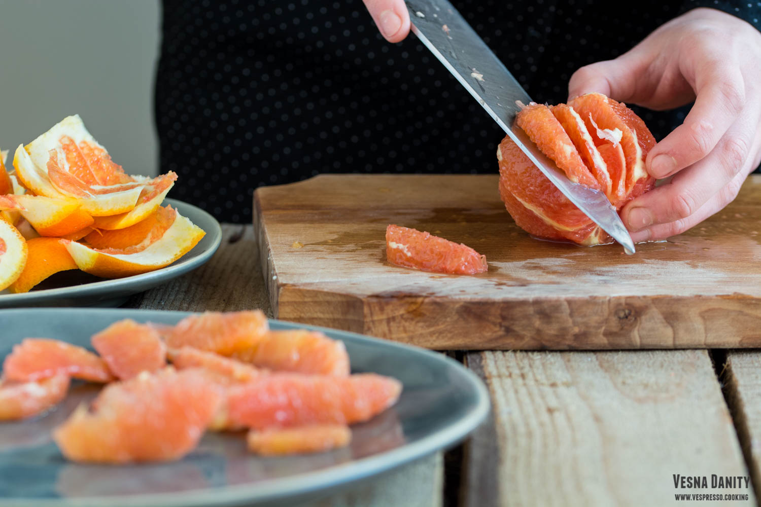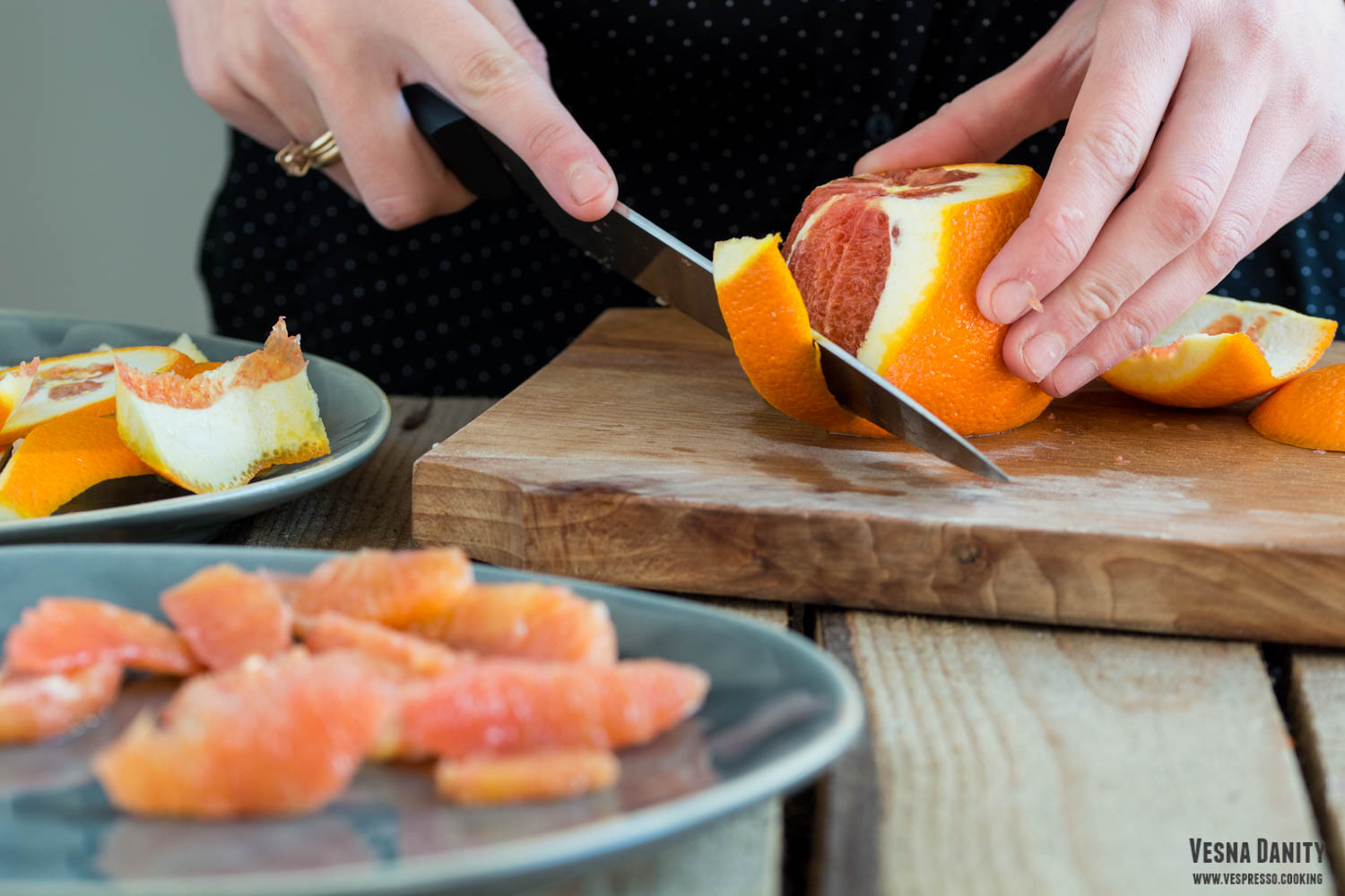 - Am decupat feliile de portocală în felul următor. Am decupat baza și vârful portocalei, obținând două capace late de un deget. Am așezat portocala cu baza pe fundul de lemn și am decojit-o de jur împrejur, înlăturând atât coaja portocalei cât și membrana ei albă. După ce am decojit portocala, am așezat-o pe o parte, fixând bazele între degete. Am decupat fiecare felie de portocală, ghidându-mă după membrane (poză).