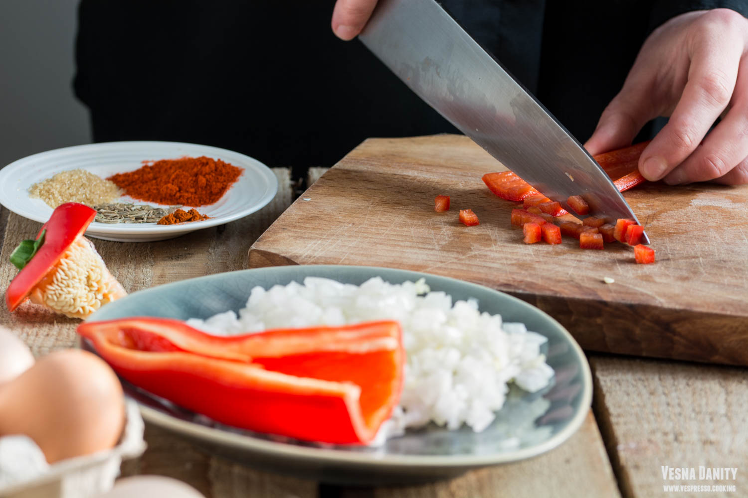 - Am tocat ceapa și ardeiul. Am pisat usturoiul.