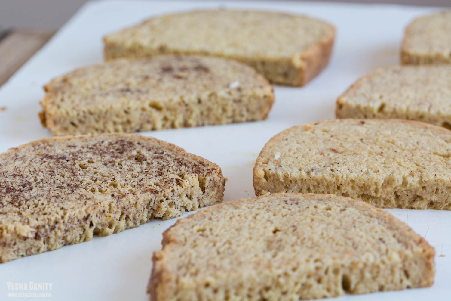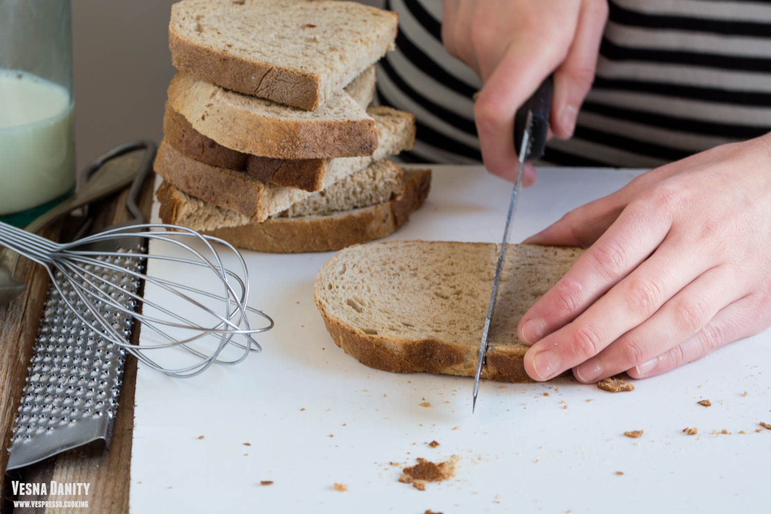 - Am tăiat feliile de pâine veche în jumătate (dacă nu am la-ndemână pâine veche, atunci folosesc pâine proaspătă pe care o deshidratez în cuptorul încins la temperatură maximă pentru 10 minute).