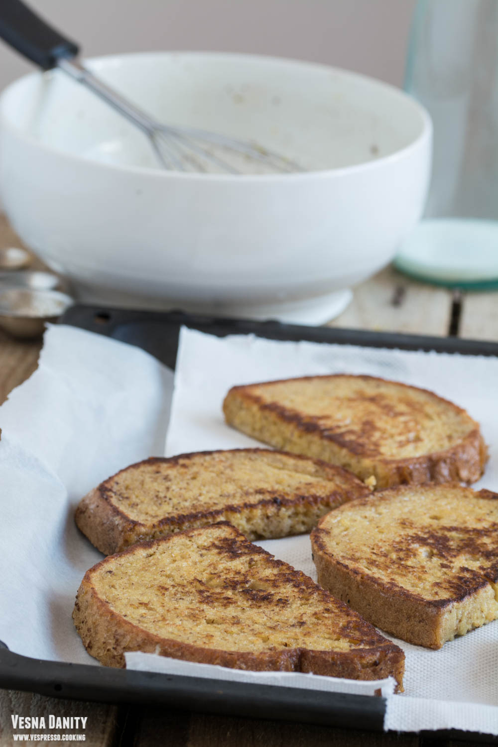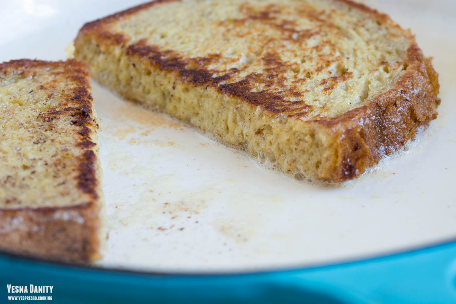 French Toast (frigănele dulci, pâine cu ou, pâine pane sau Pain Perdu) este un preparat absolut divin. În esență, nu-i nimic altceva decât niște felii de pâine veche de-o zi scufundate într-un amestec de ou și lapte aromat cu scorțișoară, prăjite la foc domol în unt, garnisite cu miere și fructe proaspete și savurate la mic dejun. Prepar această minunăție de fiecare dată când mă pricopsesc cu pâine veche pe care parcă nu mă lasă sufletul s-o arunc. Mi se pare fascinat modul în care un ingredient indezirabil, asociat cu alte două trei ingredient banale, se metamorfozează în ceva sublim.