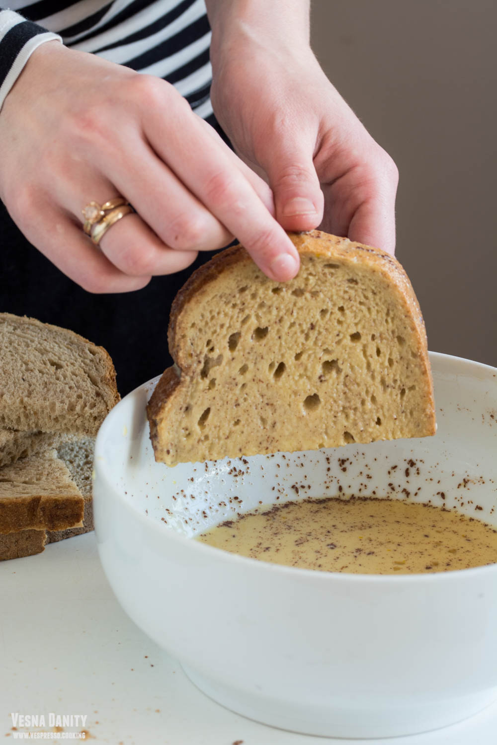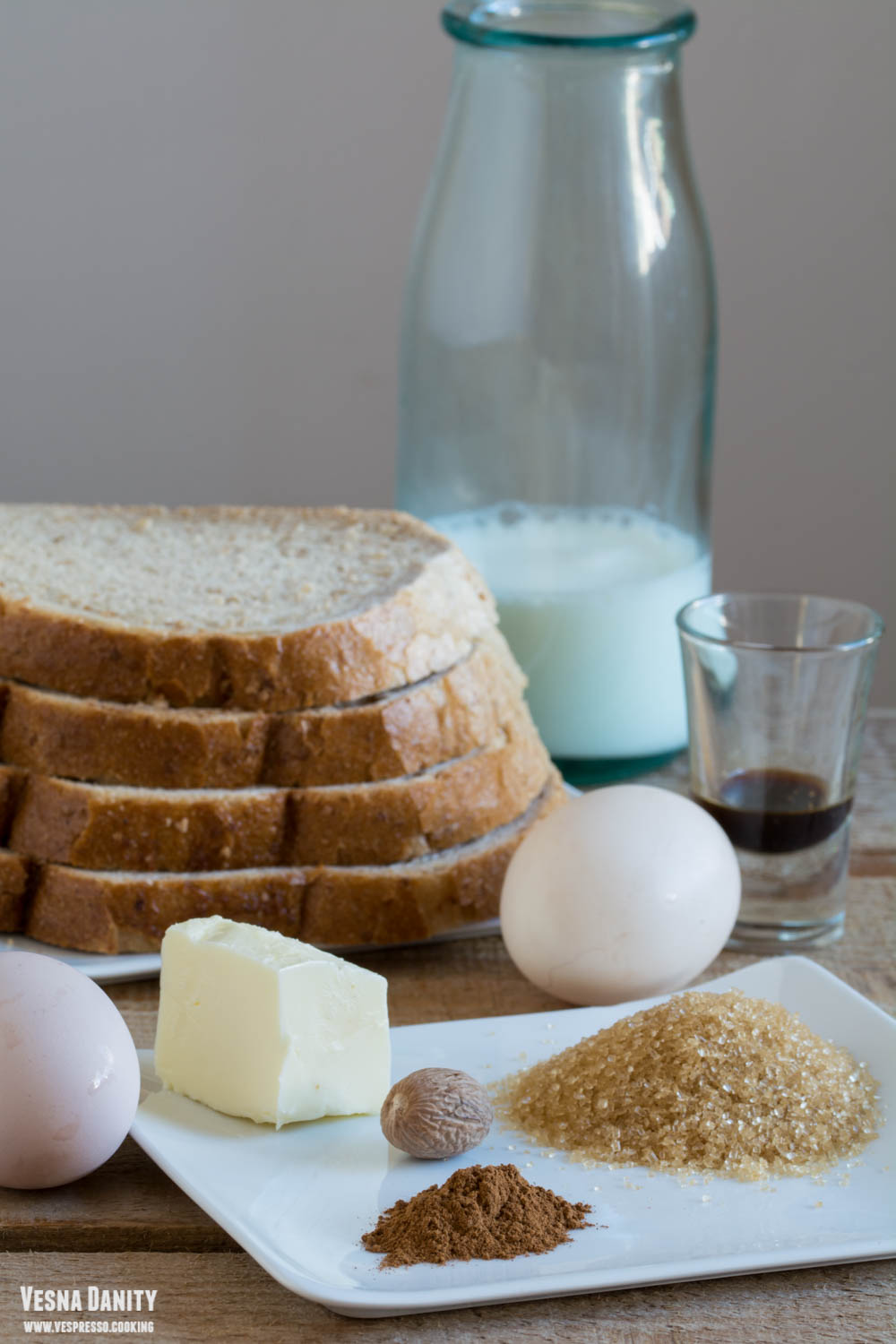 Pentru acest preparat am folosit cam orice tip de pâine, de la cea albă, la cea integrală, focaccia, ciabatta, cozonac, babka sau challah. Cel mai des folosesc pâine integrală veche de două zile, pe care o înmoi într-un amestec de lapte, ou și zahăr brun aromatizat cu vanilie, nucșoară și scorțișoară. Pâinea veche dă preparatului o consistență nemaipomenită; nu-i capăt de țară nici dacă pâinea-i proaspătă, nu-i nevoie să aștepți două zile până când dumneaei catadicsește să se usuce, o poți deshidrata în cuptorul încins timp de vreo 10 minute. Astea fiind spune, hai să ne apucăm de treabă!