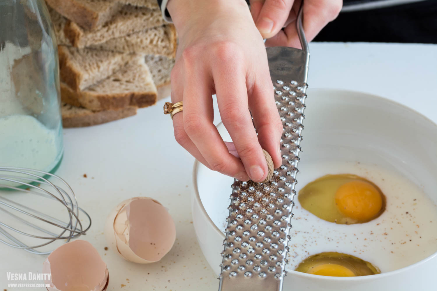 - Într-un bol încăpător am amestecat cu un tel ouăle împreună cu zahărul, laptele, vanilia, scorțișoara, nucșoara și sarea.
