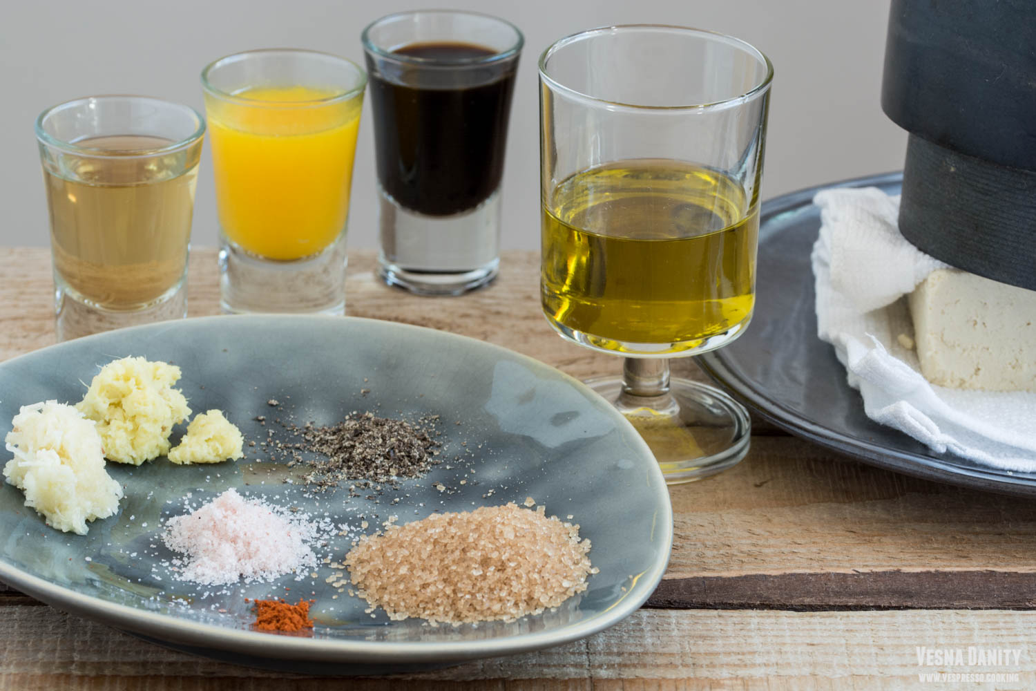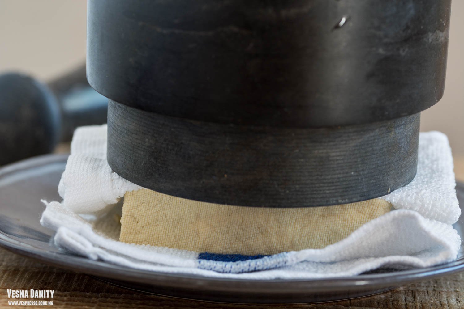 - Am scos brânza tofu din cutie, am șters-o cu un prosop de hârtie și am așezat-o între alte două prosoape. Am presat-o cu o greutate (eu am folosit mojarul) pentru a elimina lichidul în exces. Am lăsat-o deoparte pentru 30 de minute.