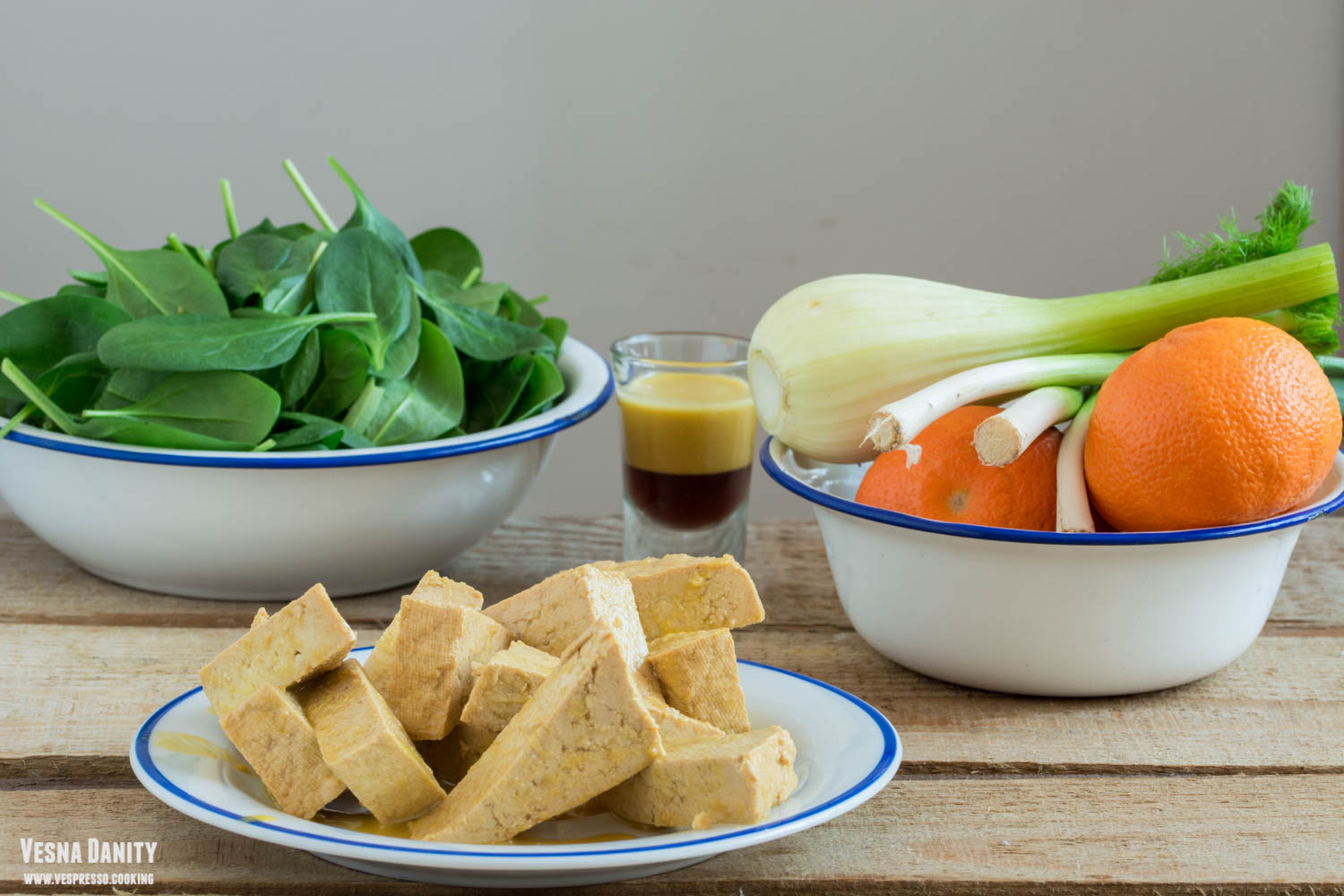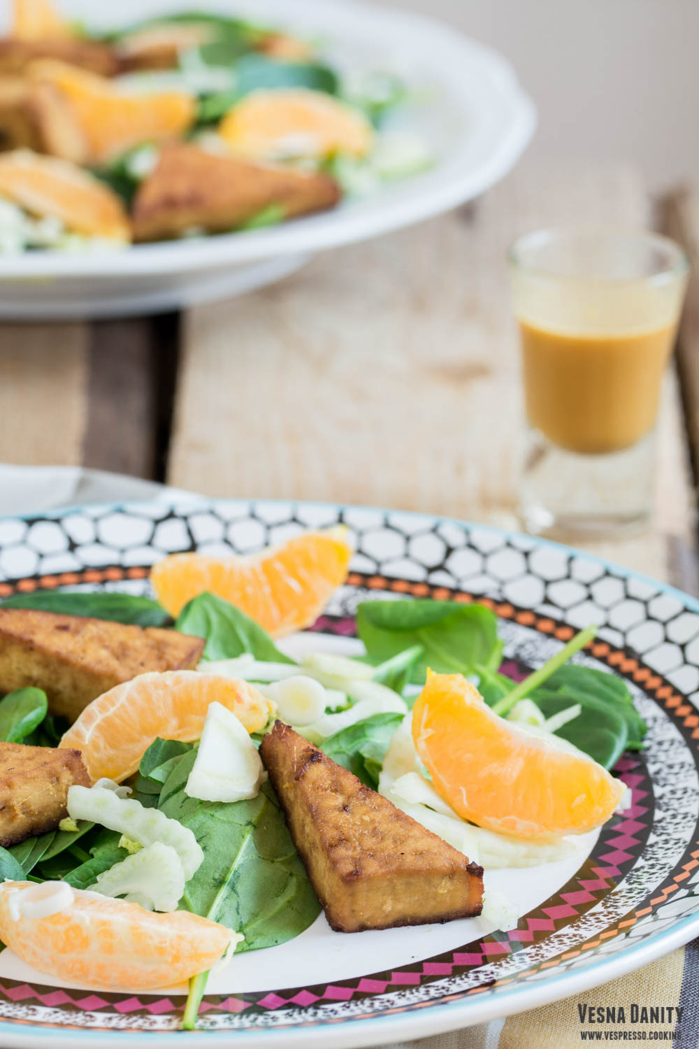 - Pe un platou am așezat spanacul, după care am distribuit feniculul, ceapa verde, feliile de mandarină și triunghiurile de tofu. Înainte de servire am stropit salata cu dressing-ul refrigerat.