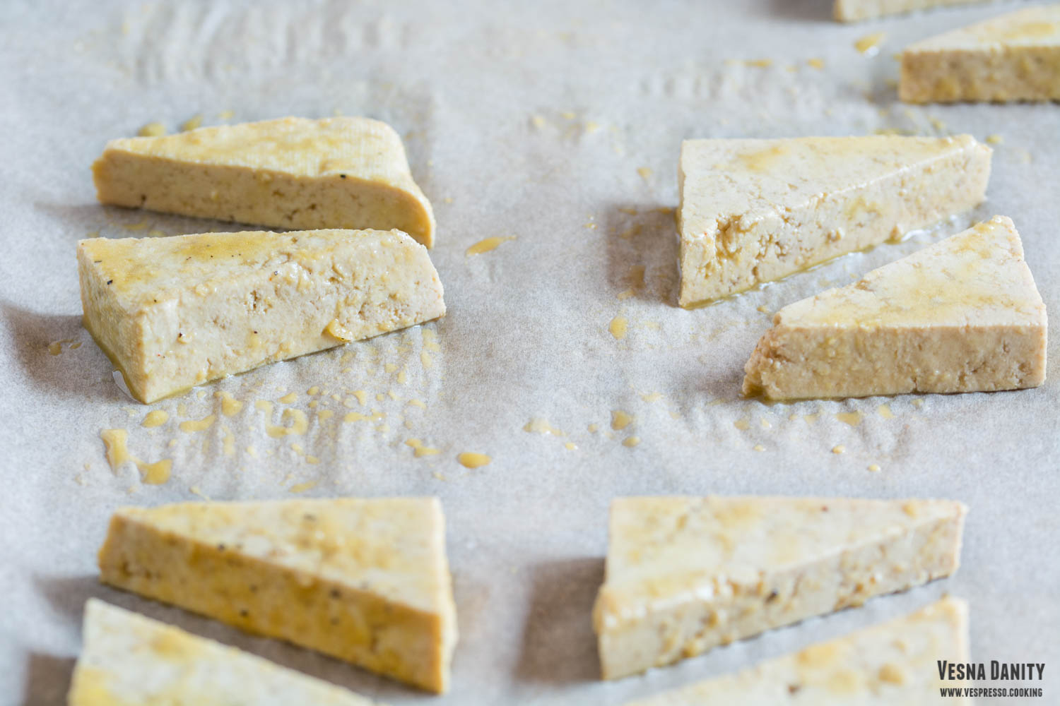 - După ce s-a scurs timpul de marinare, am luat o tavă tapetată cu hârtie pergamentată și am așezat triunghiurile de tofu pe ea. Am copt triunghiurile timp de 15 minute, după care le-am întors și am reintrodus tava în cuptor pentru alte 10 – 15 minute. După ce s-au rumenit frumos, le-am scos pe o farfurie și le-am lăsat deoparte.