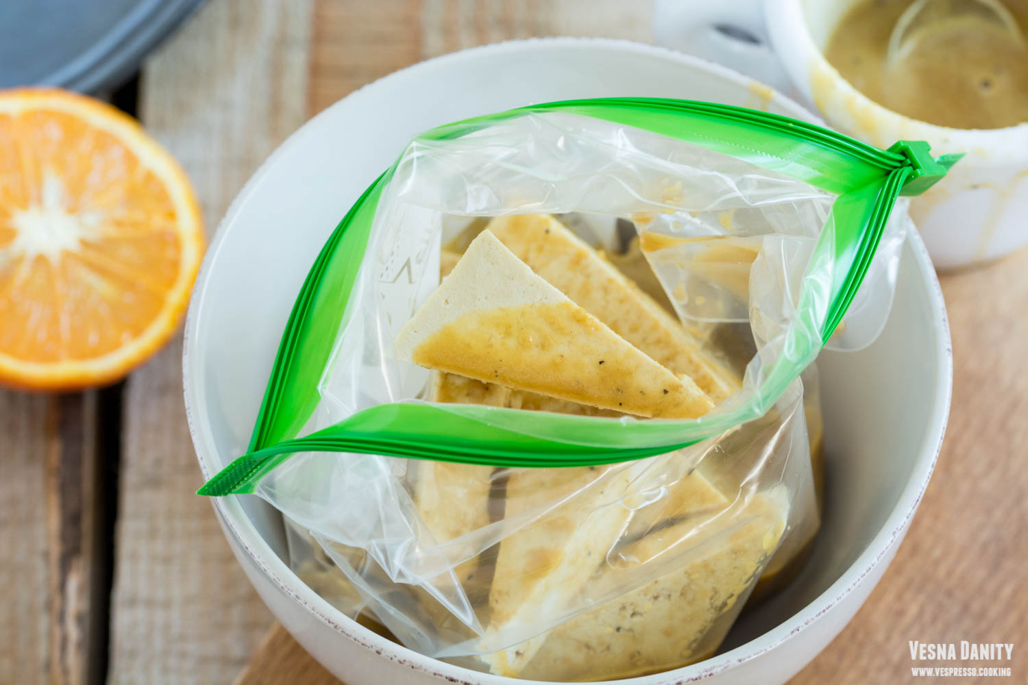 - Am luat o pungă resigilabilă și am așezat triunghiurile de tofu în ea. Am turnat 2/3 din marinadă peste brânză (restul l-am păstrat la rece pentru a-l servi ca dressing) și am amestecat cu grijă. Am lăsat feliile la marinat pentru o oră. După 45 de minute am preîncălzit cuptorul la 190°C / 375°F (treapta 5).
