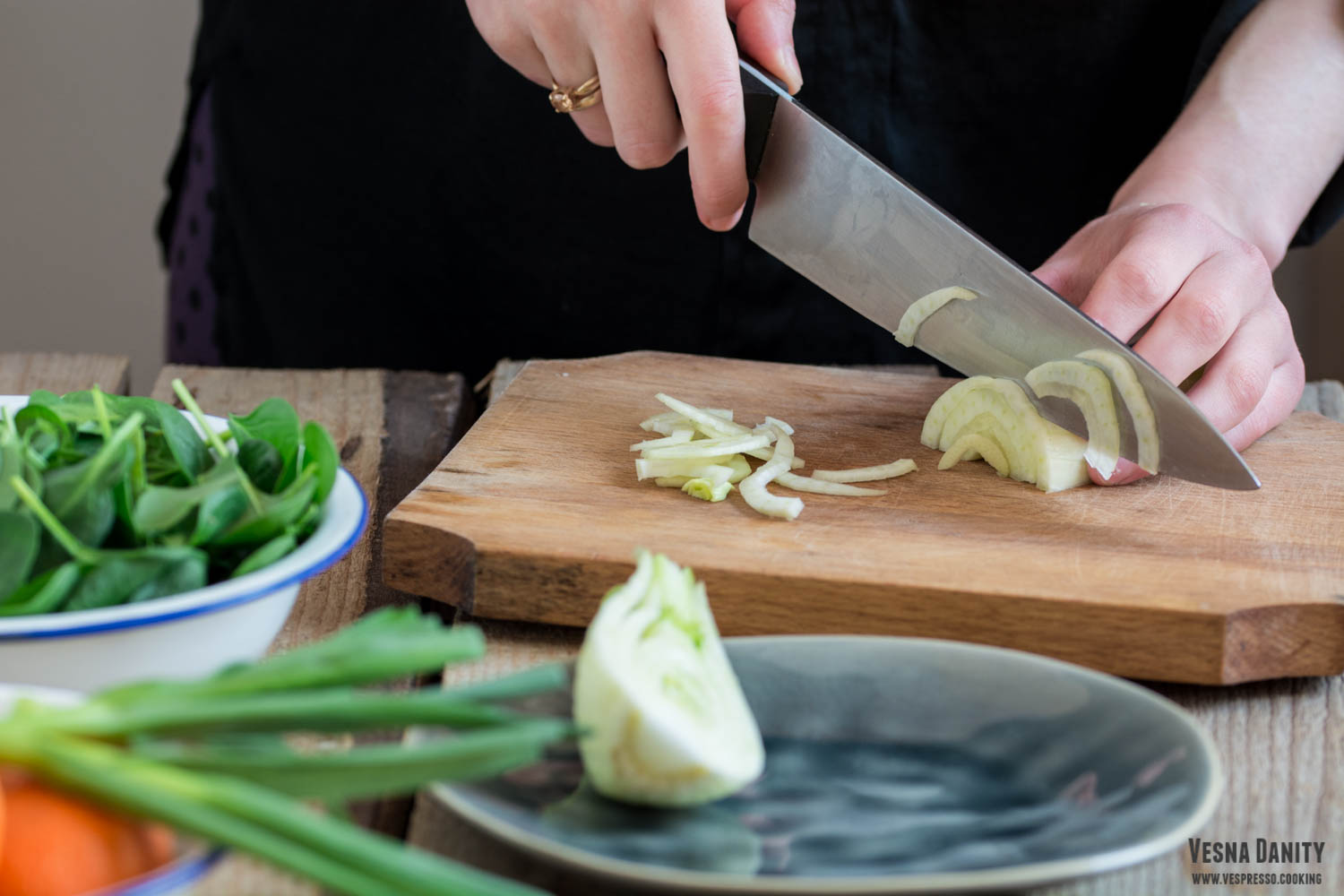 - Am decojit mandarinele și le-am separat felie cu felie. Am tăiat ceapa rondele. Am tăiat feniculul în felii subțiri (poză).