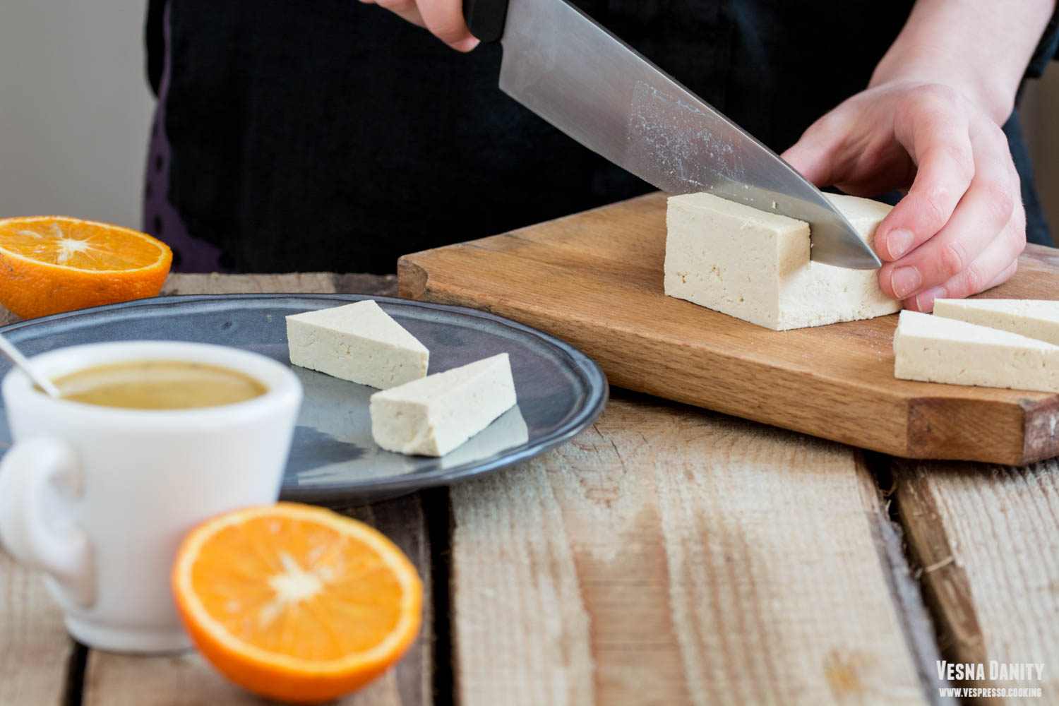 - Am luat bucata de tofu și am tăiat-o în 6 dreptunghiuri, după care am tăiat fiecare dreptunghi în două, pe diagonală (poză).