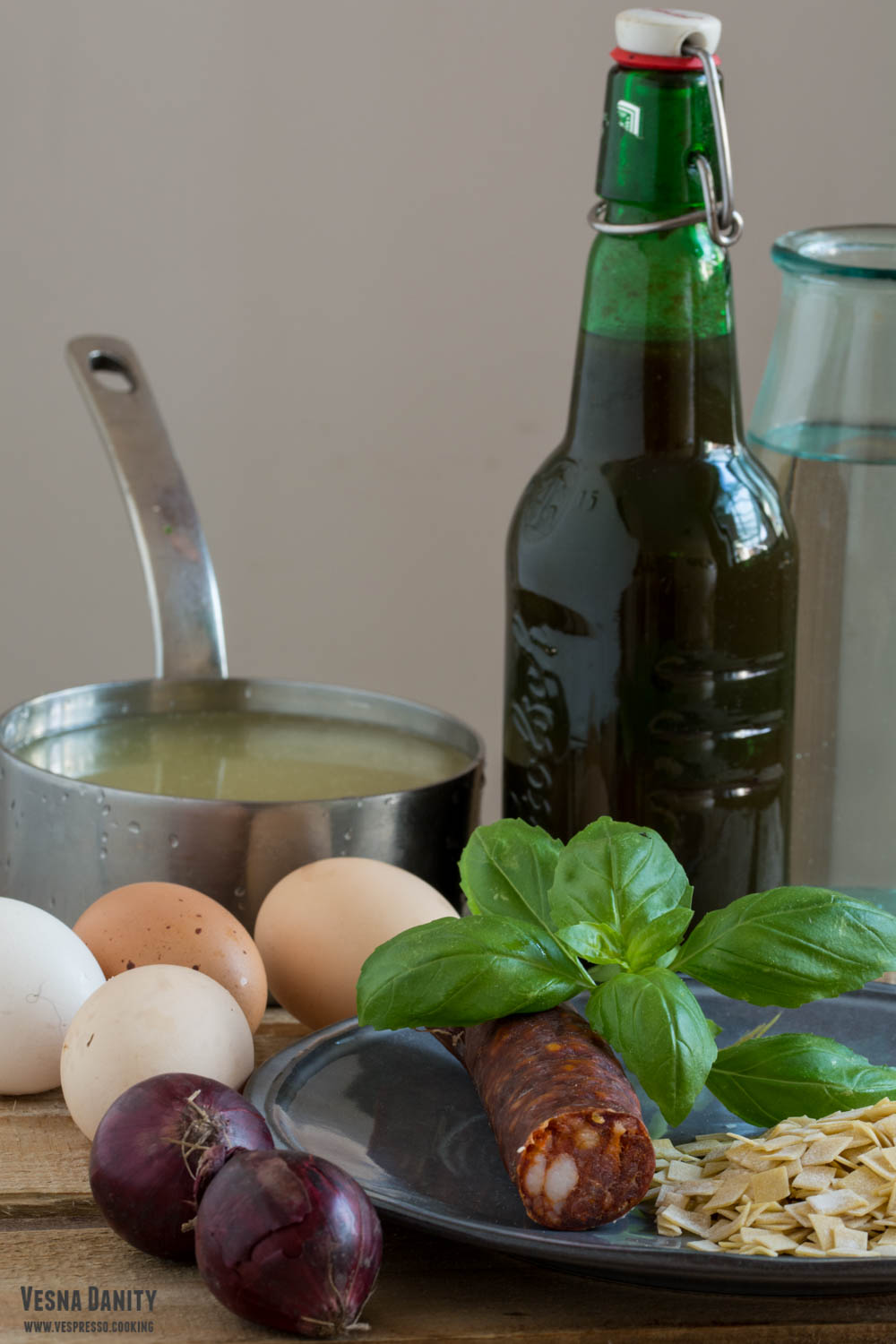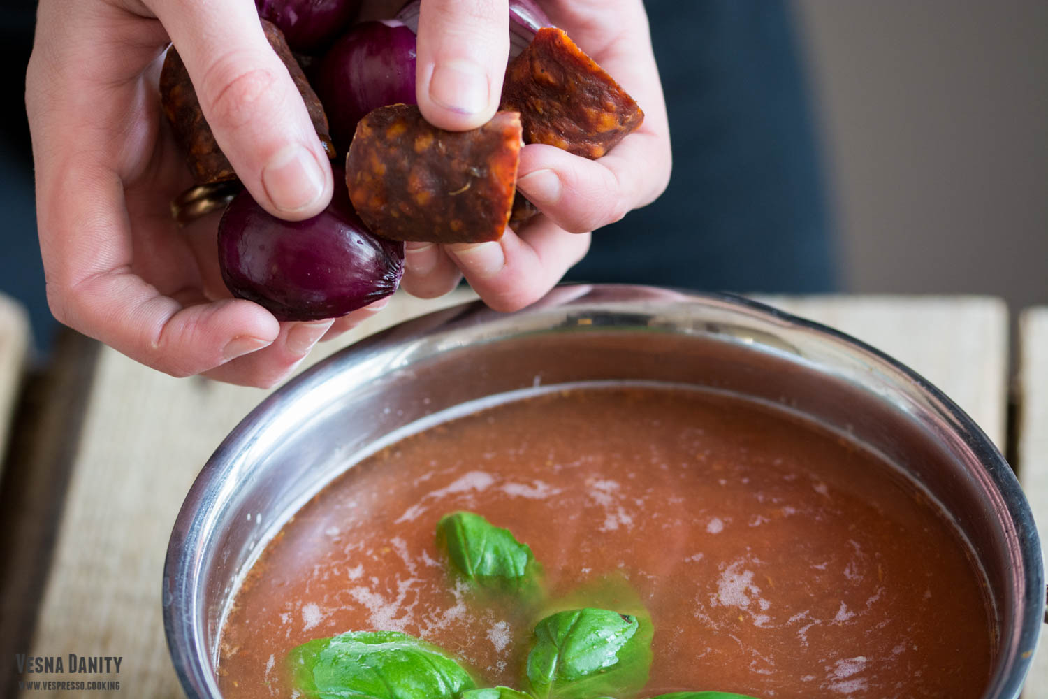 Supa de roșii cu cârnați și ouă poșate, o supă pe cât de rustică, pe atât de gustoasă. E supa copilăriei mele, e supa dimineților cu „roșu-n gât”, e supa de dinainte de teme și supa zilelor dulci de vacanță. E o supă a contrastelor, sucul de roșii parfumat cu busuioc proaspăt se împletește cu aroma cârnatului afumat, iar geometria perfectă a lășcuțelor de casă întregește frumusețea imperfectă a oului poșat.