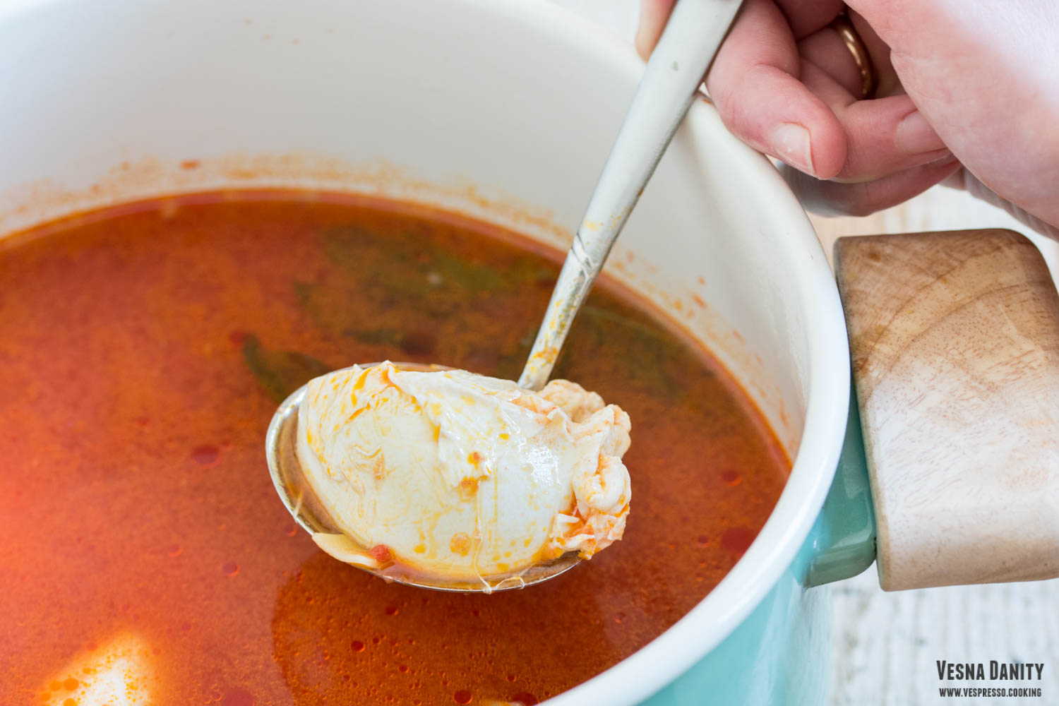 6. Am servit supa în boluri, împreună cu ouăle poșate, bucățile de cârnat și șalota.