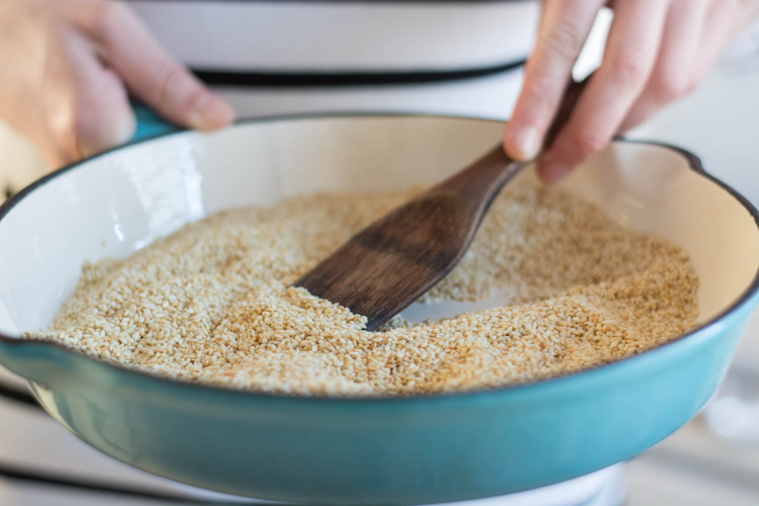 - Am așezat semințele de susan într-o tigaie de fontă și le-am prăjit ușor, la foc mediu, amestecând încontinuu cu o lingură de lemn. Le-am ținut pe foc până când au devenit aurii și parfumate (cam 3 – 4 minute). Rumenirea lor excesivă dă un gust amar pastei de susan.