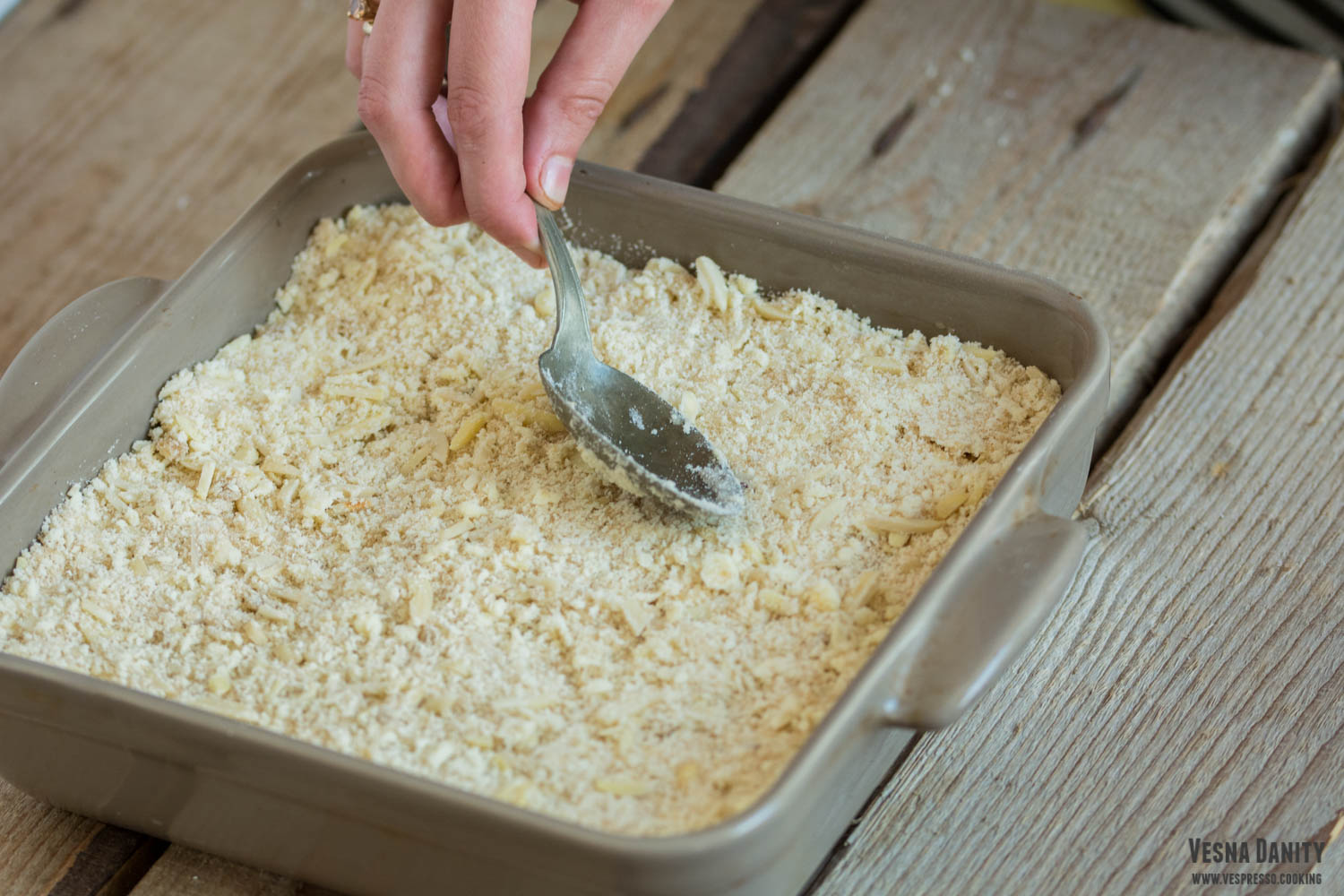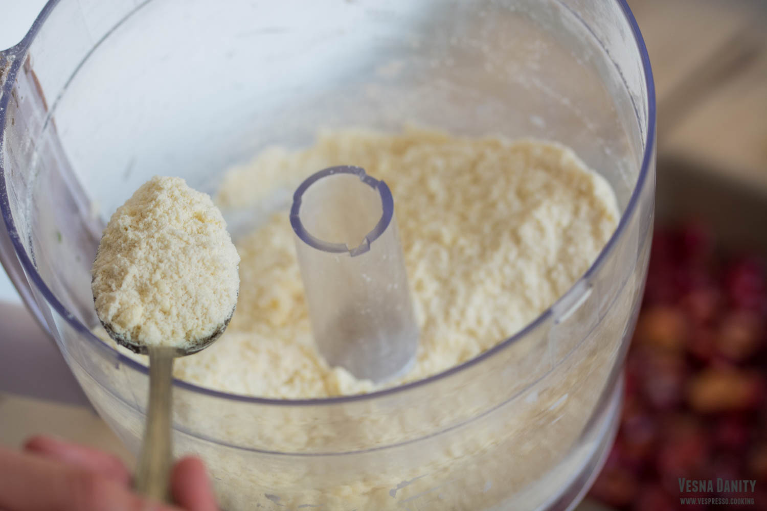 - Am turnat amestecul din vasul robotului de bucătărie peste cireșele din tavă, după care l-am nivelat cu o lingură.