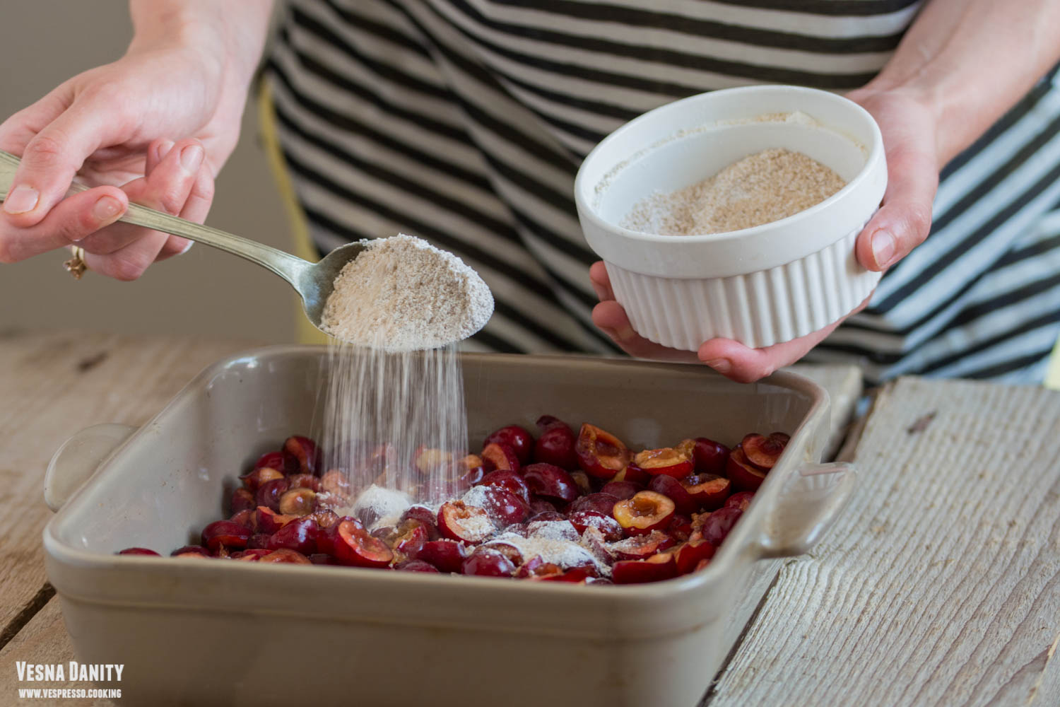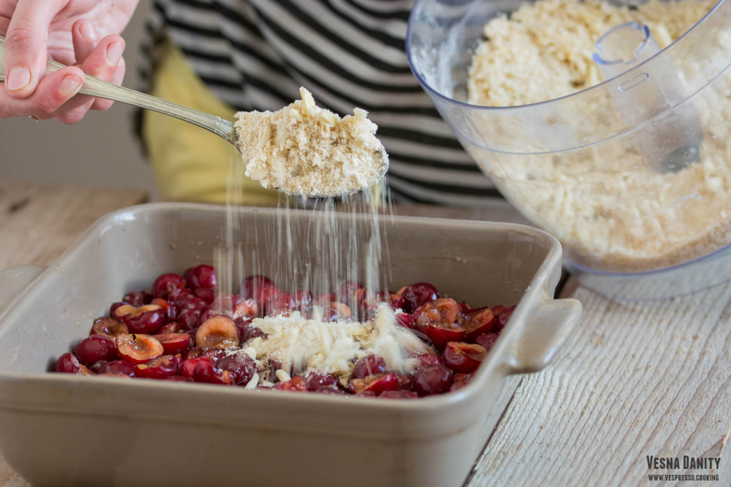 Crumble-ul nu-i nimic altceva decât un strat generos de fructe de sezon, acoperit cu nonșalanță de un amestec sfărâmicios de făină și unt rece. Fructele se gătesc lent în sucul lor propriu, creând un sos aromat, parfumat și mătăsos, în timp ce crusta sfărâmicioasă se rumenește frumos. Nu-i cel mai estetic desert din lume, cu asta sunt de acord, dar gustul e unul pur si simplu divin. Pentru această variantă de crumble am ales cireșe pietroase de iunie, pe care le-am asezonat cu apă de trandafiri (la fel de bine mergea și extractul de vanilie sau migdale), după care le-am acoperit cu un strat generos de unt, făină, zahăr brun și fulgi de migdale. O nebunie curată!