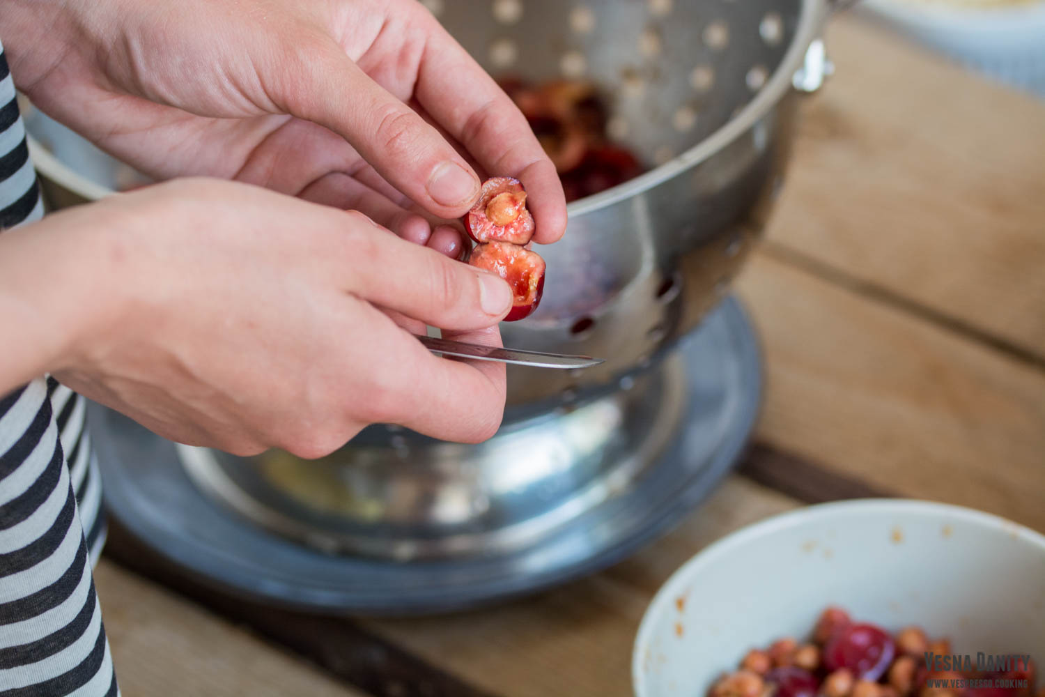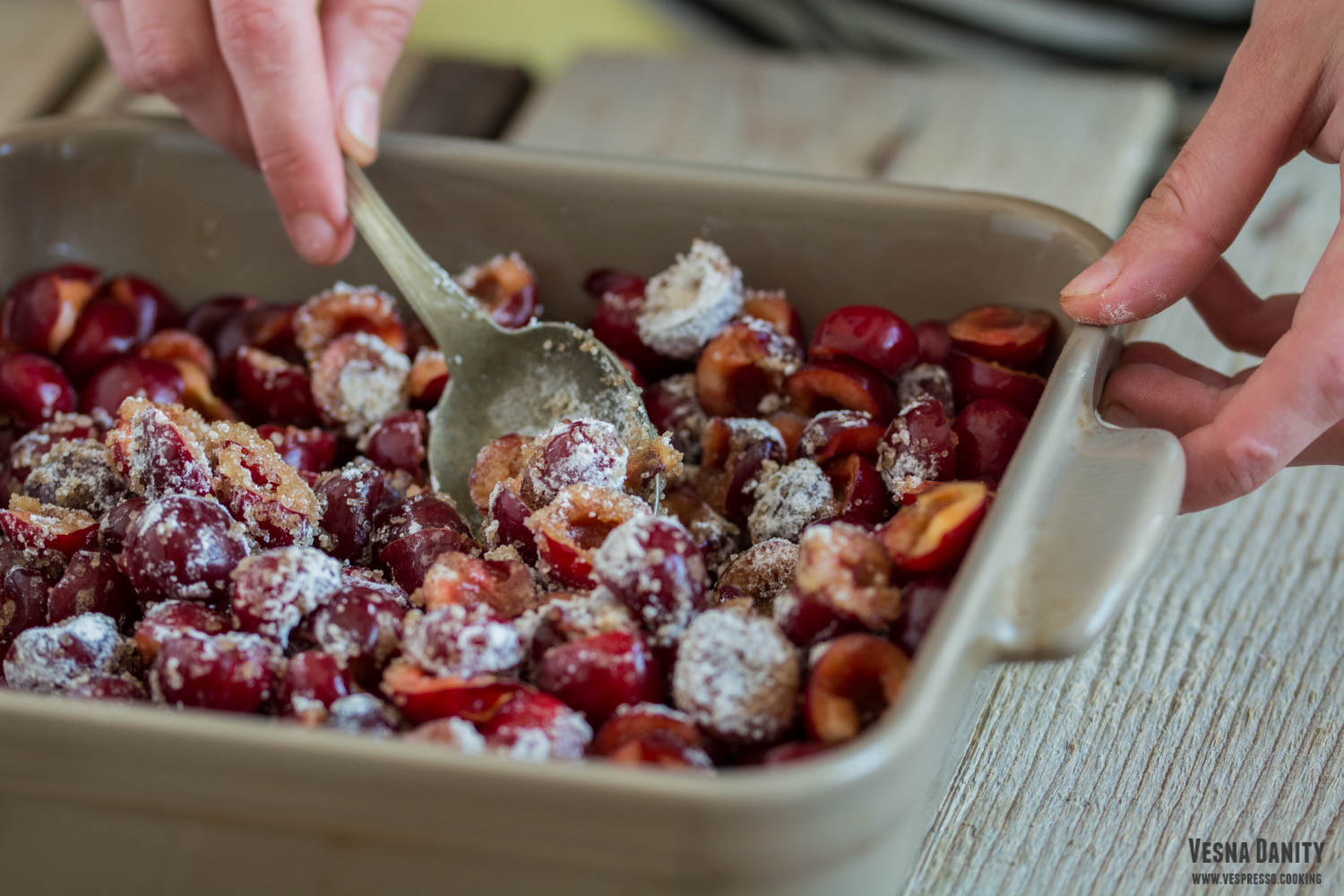 - Am spălat cireșele, le-am înlăturat sâmburii cu ajutorul unui cuțit de bucătărie și le-am așezat într-o tavă ceramică pătrată (de 20 x 20 cm).